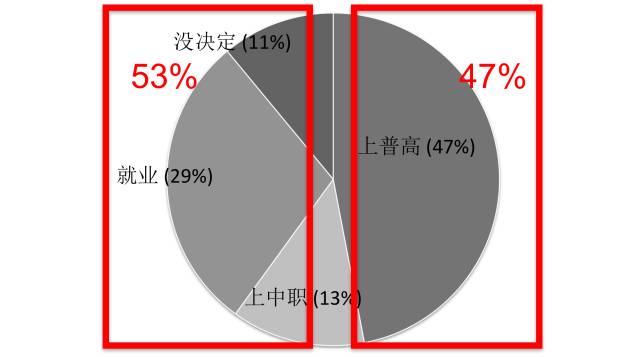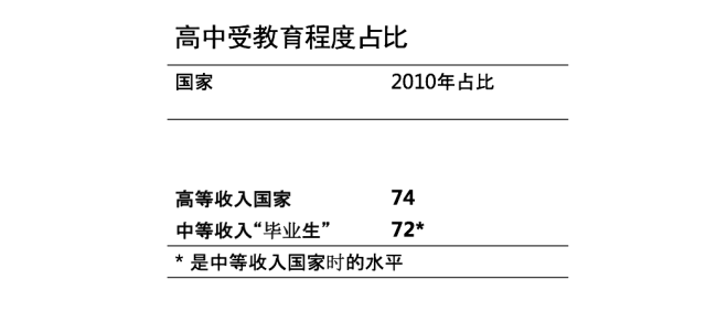 可是,中国的人力资本情况怎么样呢?我们先来看三个中国。这是三个中国,这个现在是3岁的孩子,是以后的劳动力。我们都知道中国的城市户口占37%、38%左右,可是因为城里人生孩子少,只有24%,也就是不到1/4的孩子是城里的孩子。 大部分的孩子在哪里?是在贫困农村——中部60%的农村,还有西部的农村,都属于贫困农村。除此之外,还有其他农村。 所以现在我们看看这三个中国是怎么样的。我们先看高中。 实际上,跟别的国家比,在所有中等收入(的国家)里面,中国的教育,中国的人力资本是最低的。这个不是我算出来的,是2010年人口普查的结果。 根据劳动力的定义,20岁到60岁的人口都算作劳动力人口。 上过高中和高中以上的人口占24%——4个中国劳动力里面只有1个上过高中。 跟别的国家比一比: 你就看这个,土耳其,31%,南非,28%——我们比南非还低,越南是33%。中国24%,是所有中等收入国家里面最低的。 这个是现在还在上学的人数。 最近进步很多,但也只有一半的人上高中。 这个问题是哪里的? 这个是城里的数据,中国的城里93%的孩子是上高中的。在美国,这个比例是92%,所以中国的城市比美国还好,更好。 但是你看贫困农村——接近1/3,63%的孩子一天高中都没上过,包括职中、职高。所以这个很明显是一个农村的问题。 这个是一个典型的“毕业生”,韩国。那个时候是80年代,工资一块钱一个小时的时代——现在中国的工资是两块钱、三块钱一个小时。 但是你看,早在80年代的韩国,就有将近100%的农村孩子上高中,几乎每一个孩子都上高中。 你再看80年代的墨西哥,再看看现在的中国:几乎完全一样。 可是墨西哥现在怎么样了呢?80年代的时候,它的收入开始上涨,就出现两极分化了——有很多没有上过高中的人,他们只有三个选择: