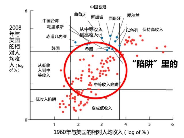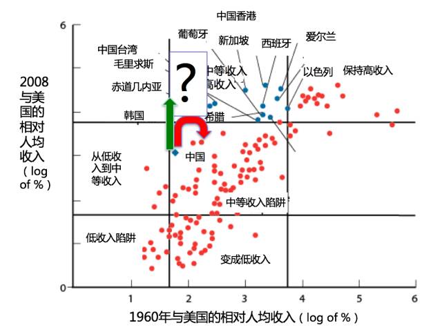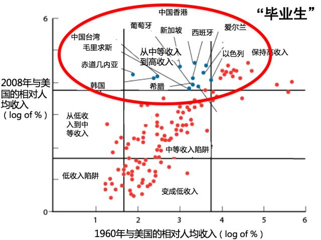 我先讲一讲为什么中国应该关心我要讲述的这个问题。 这个图表可以说清楚什么叫作“中等收入陷阱”。 其实很简单,纵轴是现在的收入,横轴是五六十年以前的收入,每一个点是一个国家或地区。 左下角的这些点,是非洲、南亚的国家,原来穷,现在仍然很穷。 右上角的点是OECD(经合组织)国家,它们原来是高等收入,现在仍然是高等收入国家——欧洲,加拿大,美国,澳大利亚,日本。 我关心的两个群体,第一个是图中蓝色的点,我叫作“毕业生”,“毕业生”是什么呢?50年前,这些国家或地区是中等收入,这50年来,它们已经从中等收入阶段“毕业”,变成了高等收入的国家或地区。 注意两点: