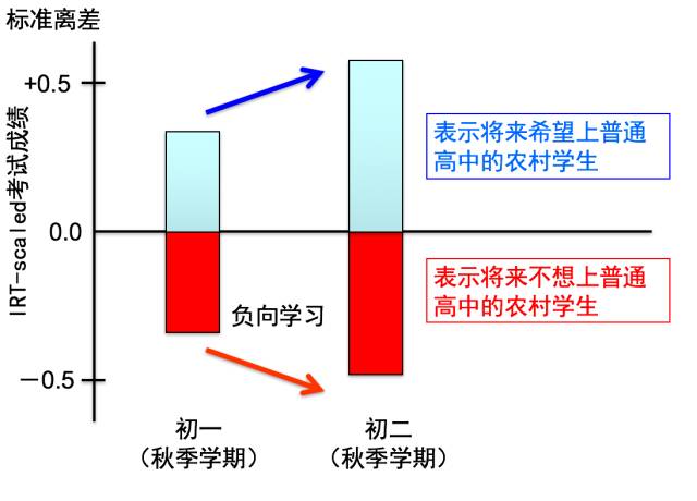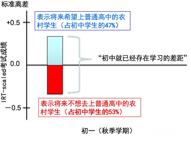 这个是北大跟陕西师范大学做的研究,我们去175所初中,做了一个很大的调查,有两万个人的样本。我们就做一个调查,问他们,你三年以后想干什么。 一半的孩子——47%的孩子,说我想上高中;然后一半的孩子说,职高,或者直接去工作——这在中国是允许的,初中毕业就可以直接去工作。最后还有一些说没想好。 我们就根据他们想不想上高中,把他们分为两类,给他们做一个考试,这个考试很特别,叫IRT-scaled测试,用于测试学习到的绝对知识。学年头尾做两次这样的考试,我们就能测出来这些学生到底今年有没有学习到新的知识。 这是刚刚开学时候的测试结果。 想上高中的学生和不想上高中的学生,分数差别很大。这个数据并不让人惊讶。 可是,第二年的6月份,我们又给他们做了一个测试,那个时候他们已经是快要上初二的学生了。结果却是这样。 蓝色是要打算上高中的学生的分数,他们知道自己以后要中考,非常认真,学得很多。 但是你看,那些不想上高中的学生,他学习到的绝对知识的值是负的——他有负面的学习,不但是没学好,而且是把小学六年级学到的东西还给了老师,他是往回退步了。 为什么初中没学好?这已经是教育的第三个阶段,我要看那个根源。 我要看两个东西,第一,是不是小学阶段没学好?是不是上初中之前没准备好?另外一个是更早的。 我先说第一个——小学这个阶段。 我刚开始做教育问题研究的时候,中国农村的学校环境是特别差的——黑黑暗暗的,有的学生没书,还有些三三两两集中在一边,乱七八糟,有时候老师也不来。现在不一样了,最近十年政府投资很多硬件,老师的工资也提高了,中央的财政直接发,所以这个不是最核心的问题。 我觉得今天最主要的问题,是营养跟健康问题。 今天中国农村孩子真的是生病了吗?我们要依靠最近十年的数据。 我们在全国收集了13万个学生的资料。