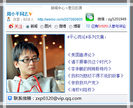 亲。那些个公知和嘴炮们从来都不是这个国家的脊梁。他们似是而非的论调里包含的是用幼稚和感官刺激对你进行洗脑式的宣传。我们今天在网络上,有媒体爆出某某官员包了情妇,然后就被抓了,被判了。然后民斗份子就会从网络上告诉你说:“你看共产党不行了,败坏了。”可是,如果是有大官在上班时间和情妇玩口交被曝光了呢?他们估计就会更加煽动你去造反。周小平告诉你,这种事真的发生了,只不过那个官是美国的官。然后民斗份子又会告诉你说:“哎呀,你看美国真好,他们的官不敢乱来,就算乱来了,也会上新闻。”最后结果是什么?结果就是克林顿继续安坐总统宝座,谁也不敢拿它怎么样。有时候又有某某官员抽了天价烟的帖子到处疯传,民斗们又鼓动你说:“快看,共产党官员无耻,烂了,臭了,快去造反。”然而不久等外国媒体也报道出法国总统顿顿吃饭都要花1.5万欧元,根据财政预算显示仅去年一年法国总统一人的饭钱就高达9600万欧元的时候,当报道出美国总统奥巴马全家聚餐一顿就花了400万美元、一个手机就值2700万美金的时候,民斗们又会纷纷对你说:“哎呀,我们连中国政府自己都没管好,哪里有功夫管人家的事,真是垃圾、败类。还不赶紧向人家学习”……