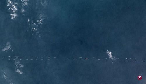 这张摄于3月26日的卫星照片显示,浩浩荡荡的中国航母编队已经进入了南海。(新加坡《联合早报》)