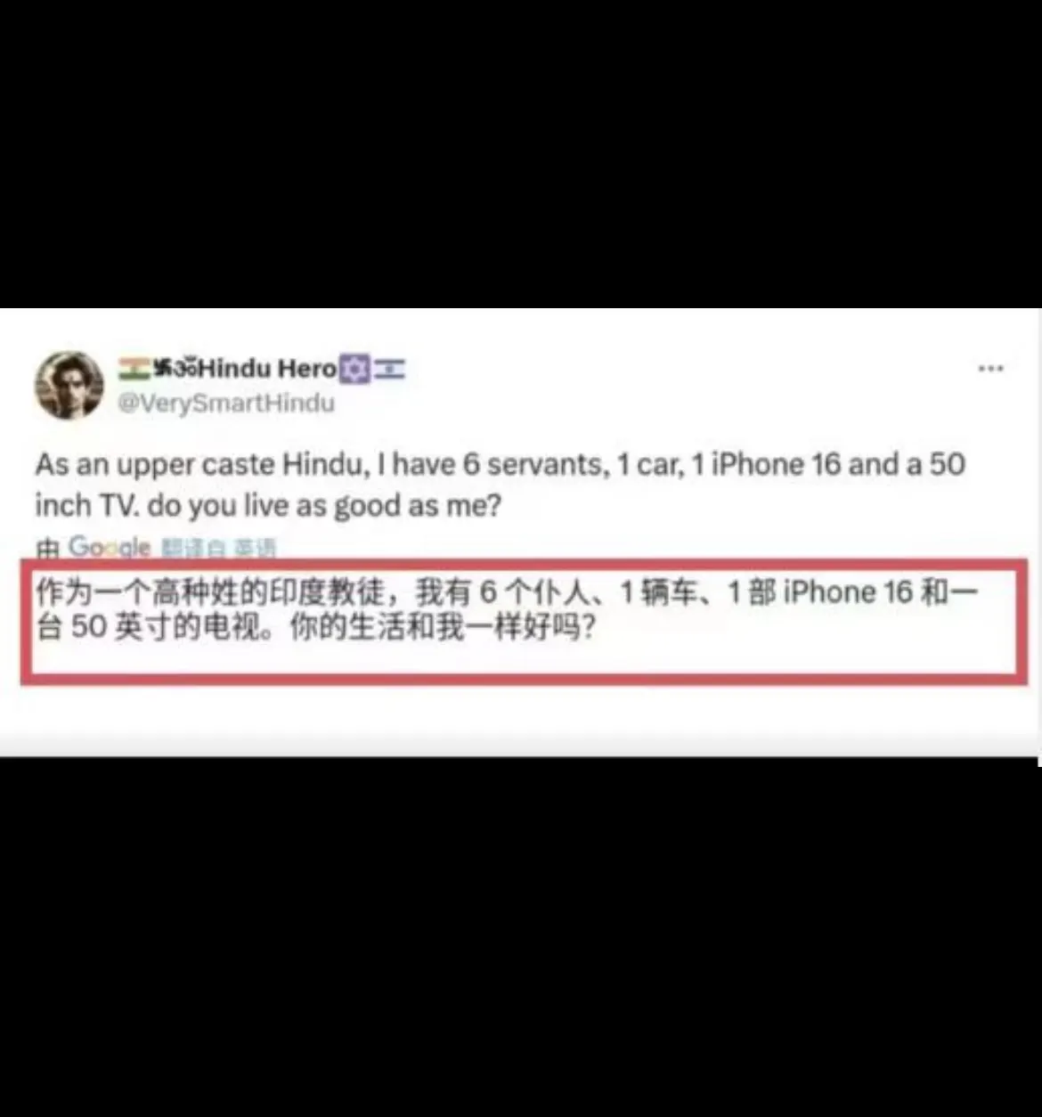 一个高种姓印度人跟中国人炫富。 短短一句话,至少暴露了两点: 1 这个印度高种姓是真几把穷。 2 他们是真的没有人人平等的观念。 话说我作为中国中产,家里有仨阿姨。 一个做饭,一个照顾病人,一个老家看房子。 本打算再请一个照顾孩子社喵不干,谁也信不着。 不算父母的,有三台车。手机啥的就别说了吧。 没电视,不看。