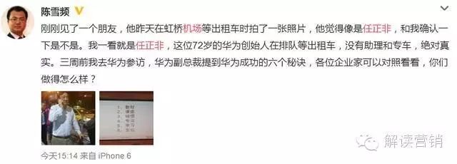 据原《哈佛商业评论》中文版社群总监陈雪频微博称:“刚刚见了一个朋友,他昨天在虹桥机场等出租车时拍了一张照片,他觉得像是任正非,和我确认一下是不是。我一看就是任正非,这位72岁的华为创始人在排队等出租车,没有助理和专车,绝对真实。”