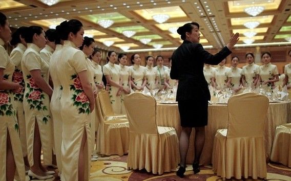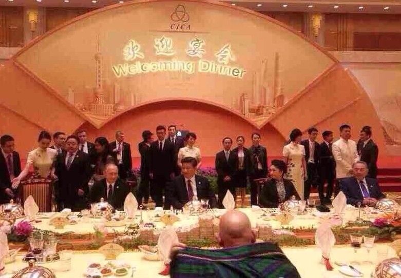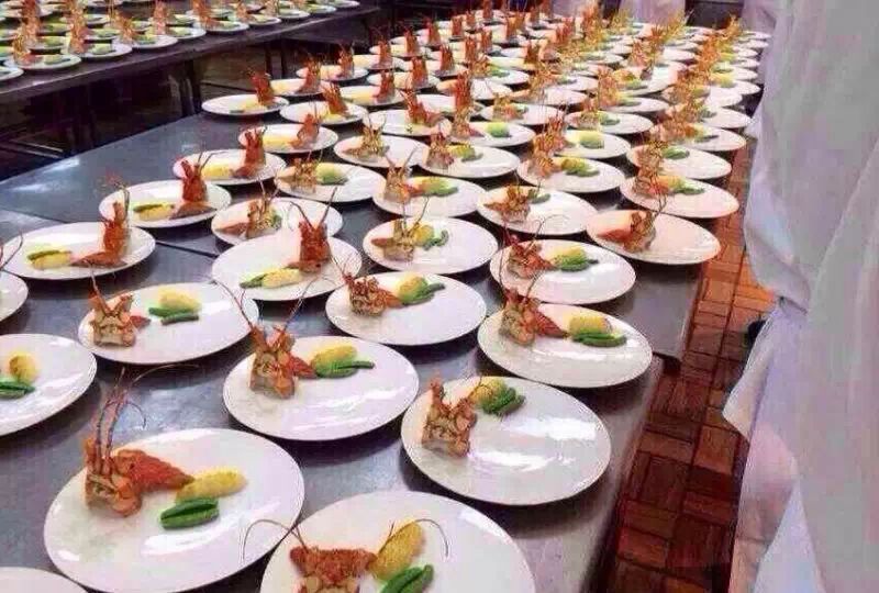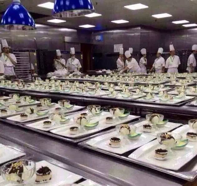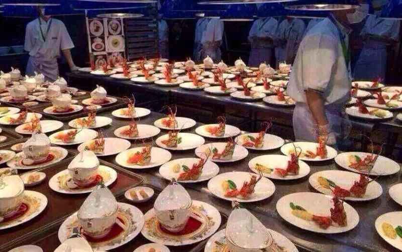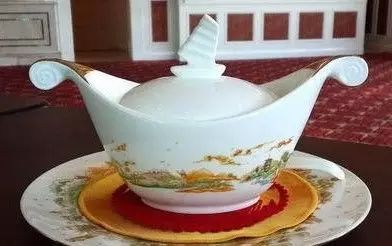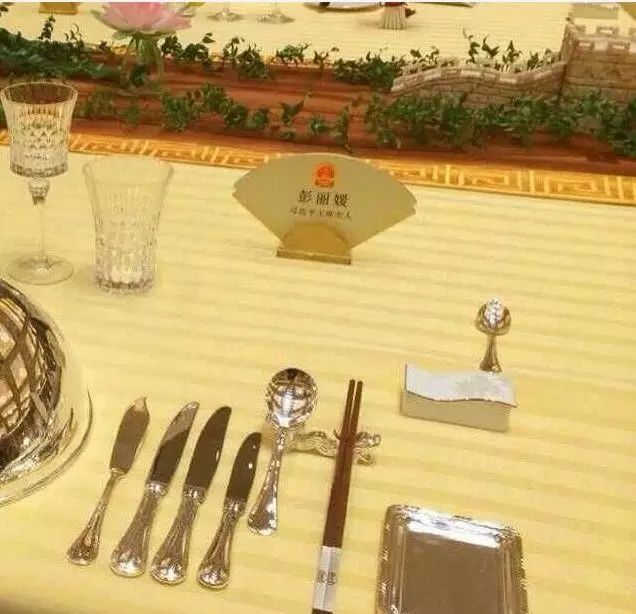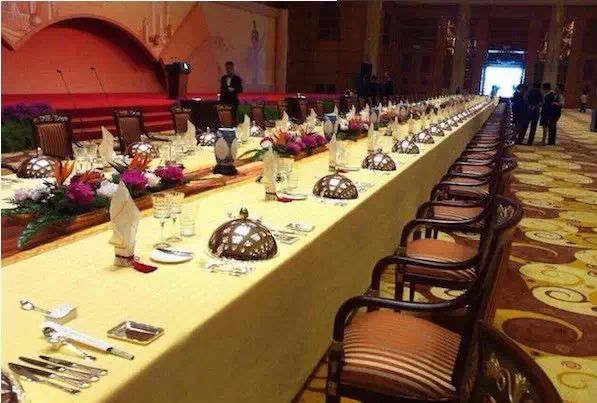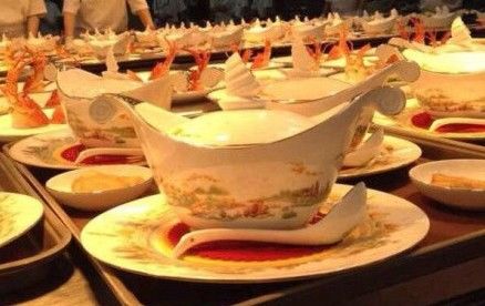 什么叫国宴!带你开开眼界摆台、布置餐具、熟悉接待流程,等等,厅面的服务人员一丝不苟!如果有个别客人“重口味”,在宴会餐台上还会配有各种调料,比如盐、胡椒粉等,客人可以根据自己的口味调节。 餐具方面,除中餐所需餐具外,还应摆上刀叉,左手边放叉,右手边放刀。公筷、公勺还应备有筷、勺座,其中一套应摆放在主人面前。APEC晚宴时,为嘉宾准备的餐具是银质刀叉和筷子。 后厨篇 碰上国宴这么高规格的接待,后厨用“打仗”来形容毫不为过!不过,这“仗"可是只许成功不能失败的!国宴对上菜的时间限制精确到秒,330多位嘉宾,每人十道菜,加起来就是3000多盘,62名厨房工作人员中掌勺厨师只有9位,大家齐心协力完成此次国宴,饮君子忍不住要给各位大厨点赞啊! 国宴现场 说到国宴,在平常百姓心中或多或少都存在一丝好奇,到底在这个有上千年饮食文化的大国,哪些菜品能被端上国宴的餐桌呢?用餐现场又是怎样? 此次国宴围绕亚信峰会“一带一路”这个文化主题来设计,体现了丝绸之路这样一个文化特色,采用的都是中国最具有地方特色的食材,尤其是江南的时令食材得到充分利用。 而且本次国宴在器皿上也充分体现中国古老文明特色,盛汤的“丝路宝船汤盅”设计灵感来源于海上丝绸之路的古船造型,汤盅的盖揪设计为一艘扬帆远航的古船帆,寓意着海上丝绸之路的历史文明。 在餐具的设计上,为了呼应“丝绸之路”这个文化设计主题,采用了牡丹元素,餐具瓷器上设计了两束盛开的牡丹花,因为丝绸之路起源于洛阳,洛阳盛产牡丹。借着中国美食的魅力,展现中国悠久的历史和艺术,这一场盛宴,总体上是简单的食材,精细的烹制,古老的文化,美好的祝愿,借助丝绸之路的文化意象,表达亚洲文化、经济、政治等交流永续写的美好愿望。 亚信峰会国宴菜单及菜品经典重现 本次国宴除了冷盘、点心、水果、甜品之外,主菜是5菜1汤,分别是松茸炖花胶、双味生虾球、煎焖雪花牛、夏果炒鲜带、豉香比目鱼、丝瓜青豆瓣。 冷盘 苏德兴是地道的上海人,所选择的食材也和“江南”挂上了钩。迎宾的冷菜整个造型选用了花篮为主题的“花篮冷盆”,在口味上也体现江南地方风味为主,食材大多原产于上海本地。 熬汤食材特地选择了清真食材,优质矿水,农户散养老鸡、鸽子、牛健、凤爪以及多种大料,熬制5小时,香味浓郁、汤清见底。