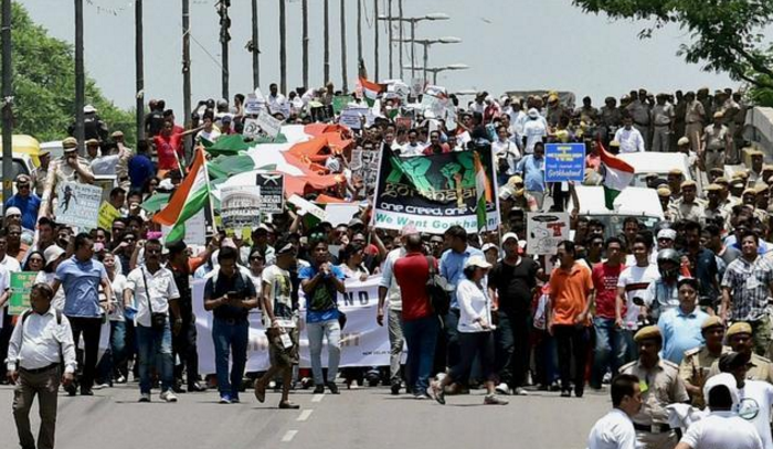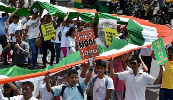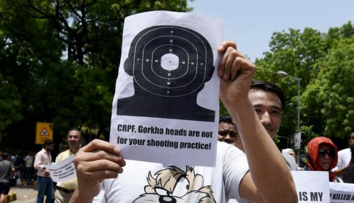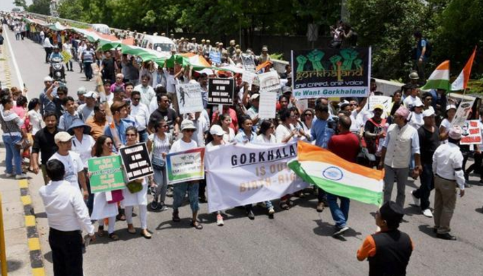 廓尔喀人7月9日在新德里举行集会要求成立一个独立的国家,抗议西孟加拉邦准军事部队到大吉岭杀害廓尔喀人(组圖) 在中印两国军队对峙时,印度东北部发生严重洪灾浪大浪。同时,8日还与巴基斯坦在克什米尔发生炮击,造成7人死亡。据印度《第一邮报》报道,9日,廓尔喀人在德里举行集会,要求从印度独立出去。 标题:大吉岭(印度东北部城市)的动荡:抗议者为廓尔喀人独立在德里举行集会