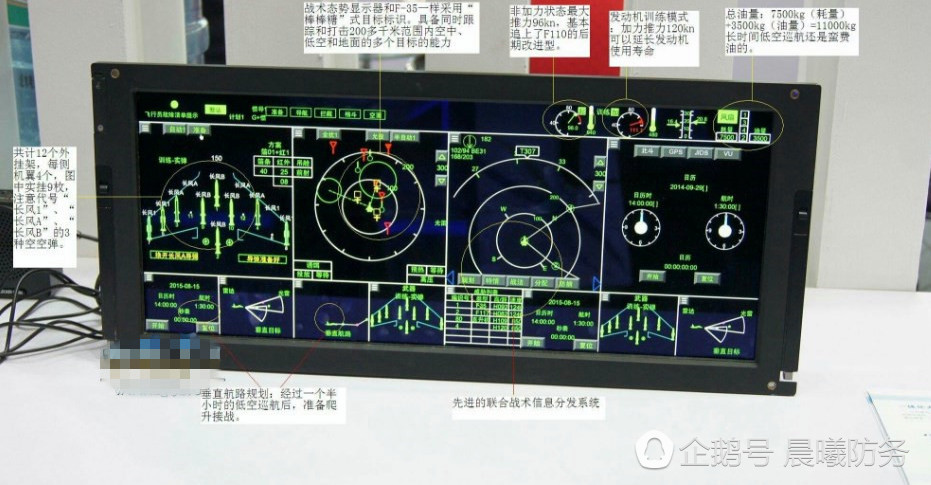 在去年的珠海航展上,我军新一代战斗机玻璃化座舱首次对外曝光,整体布局简洁合理,飞行员的正前方是一部宽屏液晶显示器,正下方还有一部尺寸较小的液晶显示器用于备份,操作杆位于飞行员的右侧,除了继续保留抬头显示器以外,总体设计与F-35战斗机基本相似。根据显示器当中的画面,我们还可以得到许多有价值的信息。第一,该型战斗机拥有多达12个的外挂点,而且没有内部弹仓的显示,可以判定其装机对象为歼11系列。目前我军装备的苏27、苏30、苏35以及国产化的歼11、歼11B、歼15座舱布局均与此不符,唯一可能的装机对象就只剩下歼16了。