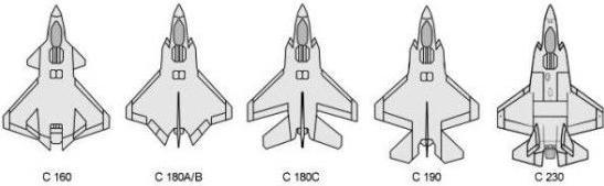 图为洛克希德-马丁在JSF计划中的投标方案演变。C160方案最终因隐形问题,让步于非鸭翼的C180无尾三角翼方案,C180A/B又因缺乏尾翼配平带来的起降问题被推倒重来,在这之后的常规布局C180C、稍作改进的C190,乃至最终被称为X-35的C230方案看似已经和最初的"美版歼二十"毫无关系,但从主翼翼型中,观者能明显发现它们之间的技术继承。