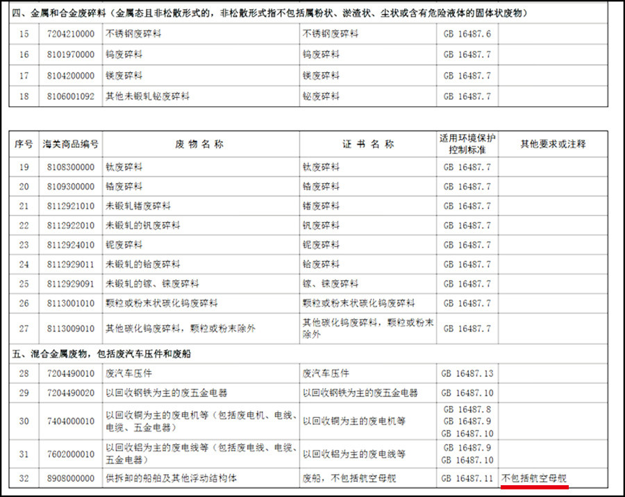 例如我国的拆船业世界闻名,已形成了以珠江三角洲和长江三角洲两大世界级拆解基地为龙头、年拆解能力达350万轻吨的资源环保型产业,位列世界第一,但为了保护环境,我国将逐渐减少拆解废船,在部分废金属名列《限制进口类可用作原料的固体废物名录》中,第32项“废船,不包括航空母舰”都将禁止进口的行列中,但有意思的是不包括航空母舰这一条让人浮想连天,世界上,我们按照废旧钢材购买的航母足足有四艘,这包括澳大利亚海军的“墨尔本”号(对船体结构和弹射器进行了详细研究后拆解为废钢)、前苏联的“明斯克”号(后来建成明斯克号航母海上乐园)、“基辅”号(天津海上公园)和“瓦良格”号(以进口废钢为名,最终改造成辽宁舰),不包括航空母舰是不是还要进口废旧航母呢?这一定很有趣。