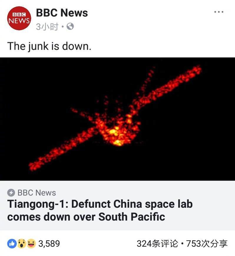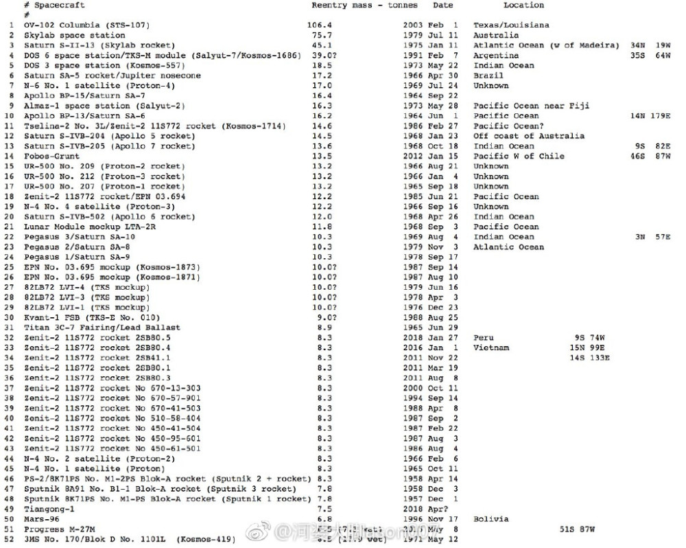 我国第一个实验空间站天宫一号今天上午再入大气层烧毁,在这前后一段时间内,天宫一号的话题成为网络热点。特别是围绕其无控再入大气层的问题,引发无数口水战,外媒更是把握机会给天宫一号泼脏水。笔者今天就来说道说道这天宫一号无控再入的问题。 天宫一号是我国第一个目标飞行器,于2011年9月29日21时16分03秒在酒泉卫星发射中心发射,飞行器全长10.4米,最大直径3.35米,由实验舱和资源舱构成。在2011年至2013年的工作时间中,分别和神舟八号、九号和十号飞船进行了对接,完成了一系列科研任务,为我国下一步的空间站研制和使用提供了宝贵的第一手数据。2016年3月16日,天宫一号正式终止数据服务,全面完成了其历史使命。当时其平均轨道高度约370公里,以每天100米的速度衰减,预计2018年“受控”坠落,残骸落入指定海域。 正在转运的天宫一号 原本天宫一号的设计寿命仅有两年,当然设计使用寿命设定为两年并非我国技术不达标,而是根据航天和科研部门赋予天宫一号的预期科研任务只需要两年即可完成。但在2013年9月天宫一号达到试验寿命时,其本身状态良好,搭载设备和燃料仍然满足工作需要,所以又超期服役了两年多,直到2016年终止数据服务。即便到了这个阶段,天宫一号仍然是可控的,当时的计划也是可控再入坠毁,不过在计算其飞行轨道后,有关单位认为没有必要进行控制也能无害再入,于是将仅存的变轨燃料用作了计划外的实验。 说到这里,大家应该明白了,天宫一号的飞行任务是在不断调整的,我国航天部门是在确保安全的前提下,最终决定让天宫一号无控再入大气层坠毁。很多人对于无控再入坠毁也不太了解,认为天宫一号会像流星一样冲入大气层,直接砸到地球上。但其实天宫一号作为空间飞行器,在其下坠过程中是不断围绕地球飞行和加速的,最终进入大气层烧毁。天宫一号作为空间飞行器,其本身并不带有返回能力,因此舱体也不存在隔热能力,绝大部分零件都会在大气层中烧毁,能坠落在地球上的零部件少之又少。 天宫一号和神舟飞船对接 事实证明,我国航天部门的计算是准确无误的,2018年4月2日8时15分左右,天宫一号再入大气层,再入落区位于南太平洋中部区域,绝大部分器件在再入大气层过程中烧蚀销毁。外媒反复炒作的天宫一号砸向地面伤人的场景并未上演,其实外媒对于天宫一号的飞行轨道并不掌握,一直以来也是胡乱猜测,几乎把五大洲四大洋全都猜了个遍。 以这种不负责任的态度来向我国航天工程泼脏水,也是这些别有用心势力的一贯伎俩。 德国弗劳恩霍夫高频物理和雷达技术研究所昨天上午追踪到位于海拔161公里的天宫一号雷达影像 不过各大国际航天组织还是非常关心天宫一号的动向的,毕竟全重近8吨的天宫一号是近年来最大的无控再入飞行器。虽然重达8吨的天宫一号已经是个不小的飞行器,但比起历史上那些无控和失控再入的大家伙们,天宫一号还是要逊色太多。可控再入是指,在进入转移轨道往再入点运行之前仍可控,姿态可调。如果可控再入过程中失控坠毁,那是就算事故。如果在进转移轨道之前就无法遥控改变姿态,算无控再入,短烧了或者坠毁了并不是事故。 人类历史上无控/失控再入飞行器统计表,天宫一号的体量仅能排在第49位 人类历史上重量最大的失控再入飞行器就是2003年返回地面失事的“哥伦比亚”号航天飞机,7名宇航员全部遇难,其残骸洒落在德克萨斯州和路易斯安纳州的多处地方。牺牲的7名宇航员中有两名女性,五名男性,其中就有以色列第一位宇航员伊兰·拉蒙(Ilan Ramon)中校。 失控解体的哥伦比亚号 更让人惊悚的是,“哥伦比亚”号的悲剧并非突然发生的意外,致命故障早在返回前就已被发现。“哥伦比亚”号惨剧发生10周年纪念日前,NASA前飞行主管韦恩·哈尔曝光NASA的高级工程师们早在航天飞机返回前就发现了致命故障,并确信“哥伦比亚”号会在返回中机毁人亡,然而NASA高层向宇航员隐瞒了事实。当时NASA没有抢修或者接回这些宇航员的办法,他们认为与其让宇航员在太空中等死,不如让他们在一场意外中离开。 哥伦比亚号惨案中牺牲的7名宇航员 撇开“哥伦比亚”号这个故障导致的失控不谈,人类历史上第二大无控再入飞行器也是美国货,那就是Skylab(天空实验室)。Skylab的再入质量也超过了75吨,是天宫一号的近10倍,虽然无控再入的过程有惊无险,但NASA还是在计算中出现失误,导致不少残片落入澳大利亚西部帕斯地区,所幸该地区地广人稀没有酿成惨剧。 1979年坠毁的天空实验室也是个巨无霸 所以说,天宫一号无论如何也谈不上是失控,也未造成任何事故,即便是无控再入历史上,天宫一号的潜在威胁也远远比不上美苏两国的前辈们,部分外媒和国内自媒体的污蔑实在是无稽之谈。其中有部分媒体在报道中明显体现出了吃不到葡萄说葡萄酸的味道。 BBC在推特上形容天宫一号是个“垃圾” “Junk”这个词的来源于十六世纪葡萄牙殖民者对中国帆船的蔑称,BBC专门用这个词来形容天宫一号,即是讽刺中国太空船的落后,又在指责中国制造太空垃圾,可以说是非常良苦用心了。不过笔者回忆和搜索了一下,英国在人类的探空探索中并未作出过杰出贡献,要知道英国是五大常任理事国中,唯一不具备弹道导弹和运载火箭研制能力的国家。英国历史上仅仅在澳大利亚发射过四次火箭,其中两