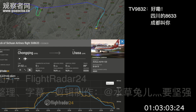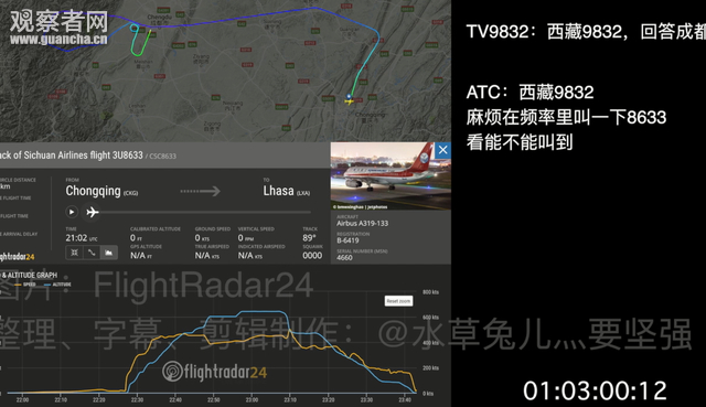 感觉空管都要坐不住了。 失联的时间越长,空管就越来越慌。 有专业的民航人士指出,视频第56秒出现的噪音,就是风挡破裂后的气流声。驾驶舱内嘈杂的环境让飞行员根本听不到空管的呼唤。 各机组的呼叫,“8633,成都在叫你”,听得眼眶都湿润了。 还有民航人士指出,在这样复杂的特殊情况下,空管人员的操作十分专业。