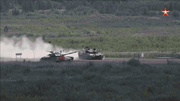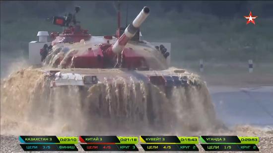 高速奔驰的96B坦克通过涉水路面的场景。在首次参加俄罗斯军事比赛的时候,我军96A型坦克曾被俄军T-72B型坦克当场超车。虽然是友谊第一、比赛第二,但赛场竞技谁也不想甘居落后。因此我国利用成熟的三代坦克动力技术,马上给96坦克“鸟枪换炮”,马上扭转了性能上的差距。本届坦克大赛上,除了俄军的T-5072B3坦克也能飚出时速71公里,其他国家的T-72玩命开也就是时速66公里的水平。