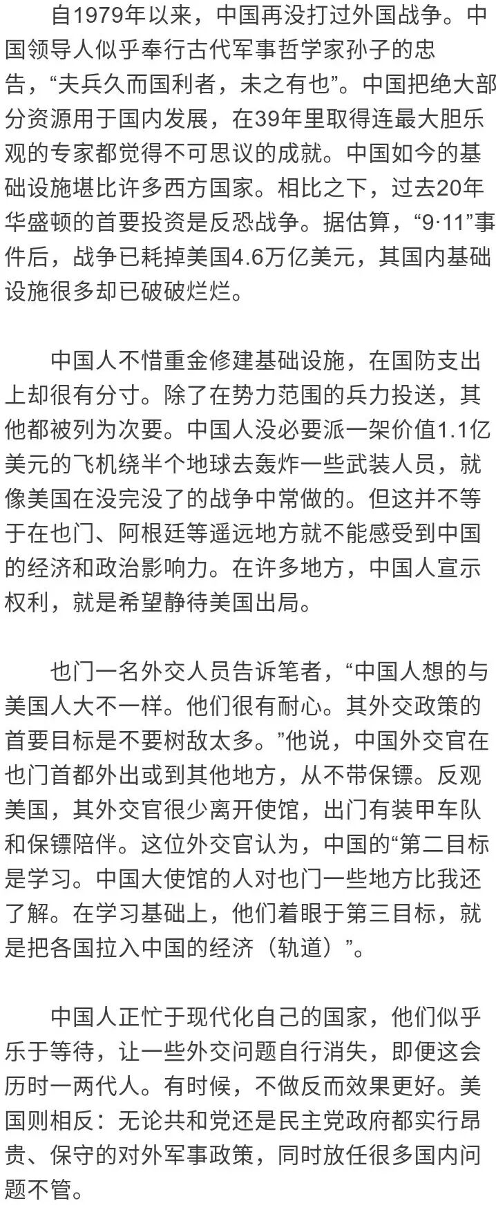 中国在静静等待我们出局《美国保守派》杂志10月22日文章,原题:中国在静待我们出局吗? 美国近几十年的外交政策总是优先考虑以军事干涉推进自己的海外利益。特朗普当选后承诺让美国远离卷入外国战争的传统。若美国专注国内问题,采取克制的建设性而非破坏性外交政策,就可能给中国崛起之路增加更多障碍。但中国人没必要担心。现在美军仍常驻阿富汗、叙利亚,与伊朗的冲突逼近,谈及干预委内瑞拉……美国继续处于长期战时态势。 这对北京是好消息。中国的外交政策与美国大相径庭。中国没采取保守、短视、忽略后果的做法,其战略审慎而高瞻远瞩。北京决策者和专家的思考和规划跨越几十年而非几个月。眼下,那些规划的着重点是建设而非(像美国那样)轰炸。这并非是说中国不顾自身利益,而是考虑将尽可能多的国家拉入其经济网络,巩固大国地位。北京放眼长远,而华盛顿将资源和全球政治资本消耗在打不赢的战争上。美国热衷对外干涉是自毁长城,而中国将是主要受益者。 中国的外交政策根植于现实主义、自我保护和对影响力及权力的渴望。他们在世界各地修建铁路、管道、道路、工厂、学校和医院。这统统是美国人曾擅长的。中国人研究、学习美国的经验。相比之下,美国决策者几乎不注意过去的经验教训。相反,其外交政策变得越来越短视,漫无目标。中国人正按兵不动,尽其所能避免冲突,对内努力解决问题,投资于基建和民生,对外广交盟友,静待美国继续过度扩张,不断变弱,最终自我消耗、一蹶不振。 作者迈克尔·霍顿,乔恒译 |