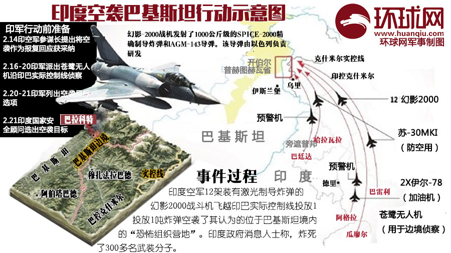 印军行动示意图 2月15日,印度空军参谋长B·S·达诺亚提出将空袭作为报复性回应,被印度政府采纳。 2月16日至20日,印度空军和陆军派出从以色列引进的“苍鹭”无人机沿印巴实际控制线侦察收集情报。 2月20日至21日,印度空军和情报机构列出空袭目标选项表。 2月21日,印度国家安全顾问阿吉特·多瓦尔(Ajit Doval)从列表中选出了空袭目标。 2月22日,印度空军选中了第1“老虎”中队和第7“战斧”中队执行此次任务,两支中队总共12架幻影2000战斗机参与任务。 2月24日,被选中的幻影2000战斗机开始在印度中部进行演练,由“天空之眼”预警机和空中加油机提供行动支持。 2月25日,行动开始。12架幻影2000战斗机分批次从瓜廖尔起飞,挂载了激光制导炸弹。同时一架印度空军“天空之眼”预警机从巴廷达起飞,一架伊尔-78加油机从阿格拉起飞,还有一架“苍鹭”无人侦察机从一处秘密机场起飞。 26日凌晨3时20分至3时30分,幻影2000战斗机飞行员对多个目标进行最终确认,指挥所随后下达投弹命令。印度战斗机沿着穆扎法拉巴德附近的印巴控制线低空飞行,使用激光瞄准吊舱指引目标并投下炸弹。 2月26日,印度国家安全局国家安全顾问阿吉特·多瓦尔向总理莫迪做情况汇报,政府领导层对行动进行了评估。 |