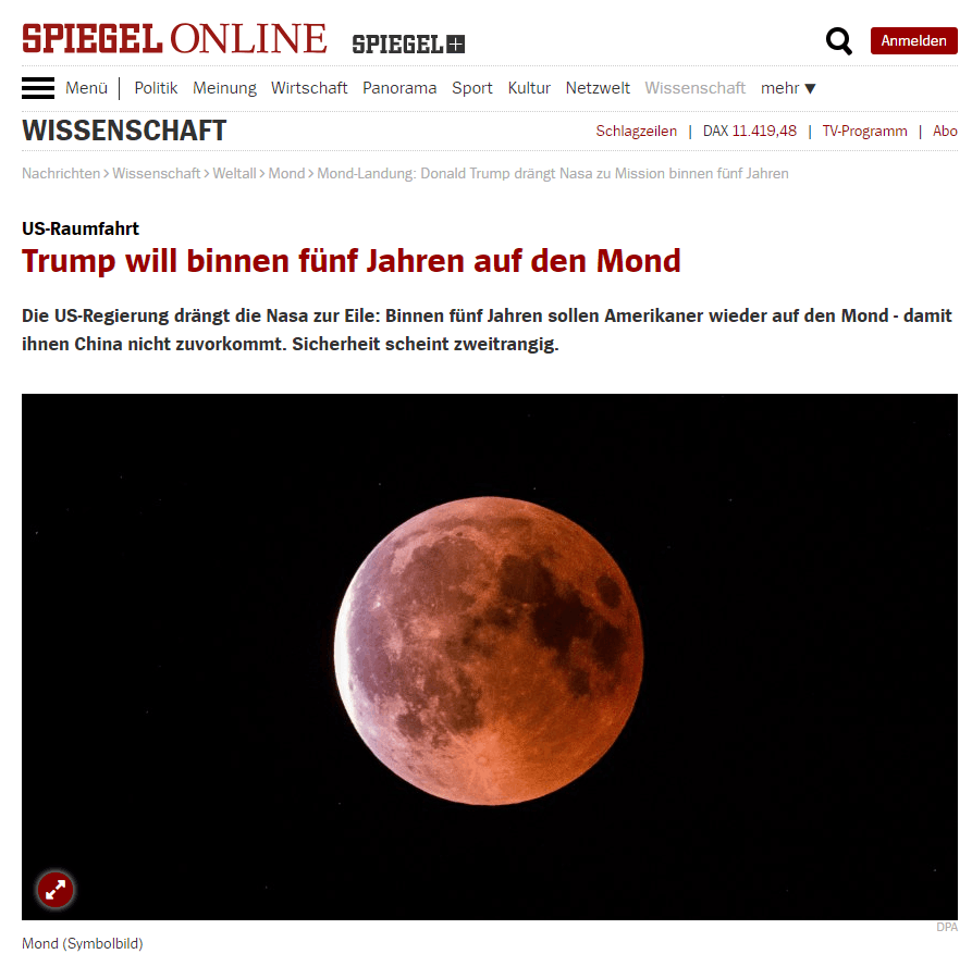 美国计划五年内重新登月 德媒:因不想让中国抢先