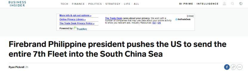杜特尔特暴脾气又怼美国:有种把第七舰队开进南海“我有个提议……美国人干脆把整个第七舰队都派到南海来算了!”多家美国和菲律宾媒体报道说,菲律宾总统杜特尔特周一(8日)又杠上美国了。上周,他刚刚吐槽美国总怂恿菲律宾在南海和中国对抗是拿菲律宾人当“蚯蚓”。 ![]() 美国《商业内幕》报道截图 据美国《商业内幕》报道,杜特尔特最新的硬怼美国的言论是这样说的: “我有个提议,如果美国想让中国离开(南海),而我又没办法让他们(中国)离开……那我要求美利坚合众国把整个第七舰队的全部力量都部署到那里” 。杜特尔特说,“只要他们(美国第七舰队)一进入南海,我也会去。我会和第一批进入南海的美国人一起前行,然后我会告诉这些美国人,‘好啊,炸吧,把一切都炸了吧’。” 熟悉国际关系的人都清楚,杜特尔特的风格,就是“敢说”。 他这番话该如何理解? 美国《商业内幕》的解读包括以下四点: ![]() 1 杜特尔特周一的言论是对美国的又一次“刺激”。 2 上周他刚指责美国“怂恿”菲律宾对抗中国是把菲律宾人当“诱饵”。 3杜特尔特 原本就质疑过美国是否有决心保护菲律宾。 4 他最新的言论是给美国的信号,也是给菲律宾国内那些批评他不敢和中国对抗的人的信号。 明白了吗? ![]() 杜特尔特资料图(图源:东方IC) 上周(当地时间5日晚),杜特尔特在一次讲话中就美国一直怂恿、逼迫菲律宾在南海对抗中国予以抨击,表示如果美国真的想帮助菲律宾在有争议海域主张权利,应该率先对中国宣战,菲律宾一定紧随其后。 在讲话中,杜特尔特先是批评美国一直在南海问题上怂恿菲律宾,把后者当“棋子”,他反问道:“美国总是在逼迫我们,你认为菲律宾人是什么?蚯蚓(意指诱饵)吗? ”杜特尔特表示,美国总是提及美菲《共同防御条约》,如果真的想帮助菲律宾主张权利,该国就应该先对中国采取行动,而菲律宾一定会因两国之间的互防条约紧随其后。“你(美国)把你的飞机、船都带来吧,打响第一枪。我们将跟在你们后面,让我们看看谁会先倒下。”杜特尔特说,“你想要制造麻烦?行,那上吧。” 菲律宾《每日问询者报》8日也报道了杜特尔特的新言论↓↓ ![]() 菲律宾《每日问询者报》报道截图 文章认为,老杜的言论是对美国的又一次挑战 。↓↓ ![]() 当然,这也不是杜特尔特第一次公开表达对美国的“不欣赏”。据菲律宾ABS-CBN网站报道,杜特尔特此前在东京会见在日菲律宾人代表时,曾猛烈批评美国的霸道行径。与此同时,此次也不是杜特尔特第一次公开表达反对因南海问题与中国开战的立场。《马尼拉公报》称,今年4月,杜特尔特发言力挺中菲关系,称中国是菲律宾的朋友。他强调,自己不可能去和中国开战。 |