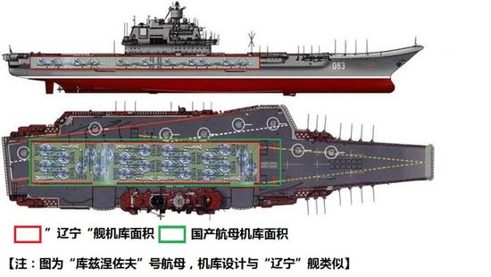苏联设计的“辽宁”号航母,其机库空间相当不合理,宽度为26米,舰体水线宽度为38米。在设计中国第一艘国产航母时,中国设计人员已经充分了解掌握了“辽宁”号设计上的不足,因此大量的采用了新结构、新材料设计,在结构强度不变,甚至更强的前提下,将机库两侧舰体厚度缩减到8米,这样来看,整个机库的宽度就达到了30米,面积也将达到5040平方米,机库内的歼-15战机装载量也能够增加6架左右,达到总数30架。