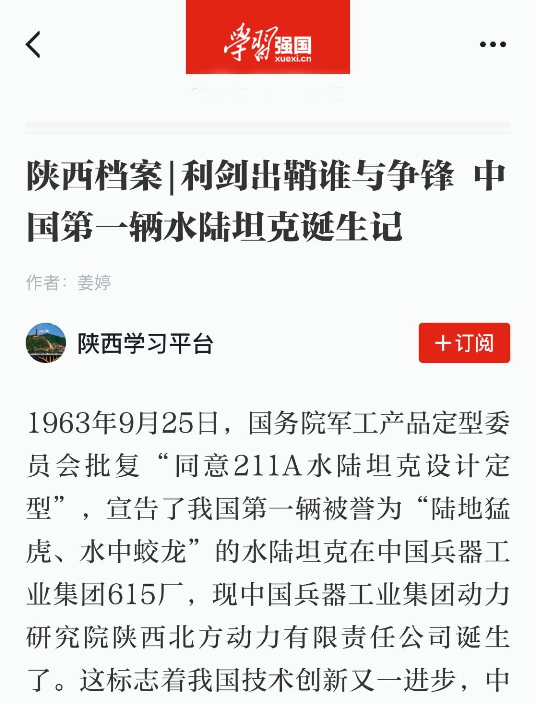 1963年9月25日,国务院军工产品定型委员会批复“同意211A水陆坦克设计定型”,宣告了我国第一辆被誉为“陆地猛虎、水中蛟龙”的水陆坦克在中国兵器工业集团615厂,现中国兵器工业集团动力研究院陕西北方动力有限责任公司诞生了。这标志着我国技术创新的又一进步,中国拥有了第一种自行设计、独立研制的两栖战斗车辆,且其火力、陆上及水上机动性能均优于当时苏联的PT-76水陆坦克。这意味着我国国防实力和对外威慑力进一步增强,该坦克的设计定型满足了当时福建前线军事斗争的需要,为国家安全增添了一根坚固的“大国顶梁柱”。