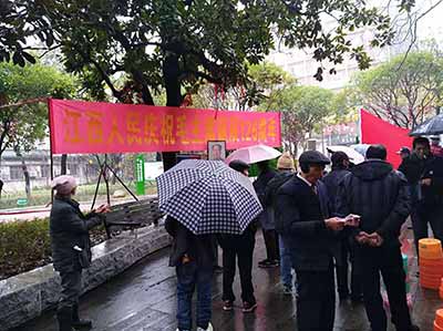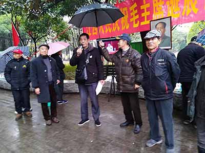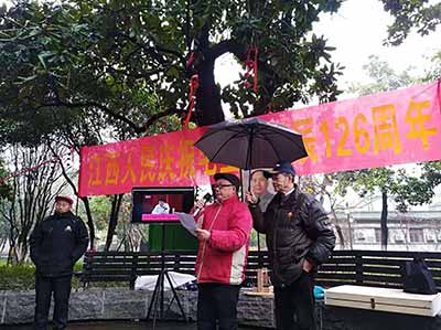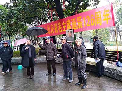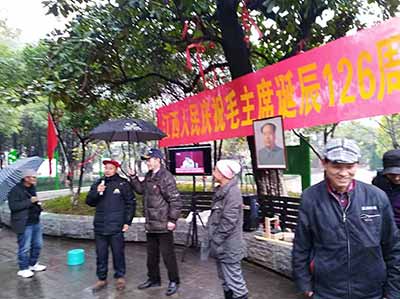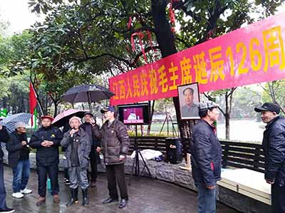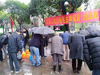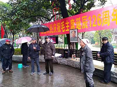 2019年12月22日星期日,预定在南昌市八一公园樟树林广场举行庆祝毛主席诞辰126周年纪念活动。天气预报全天小雨转阴。但是,到下午2两点多钟,小雨依然不停。志愿者热情不减,坚持把会场布置一番。
