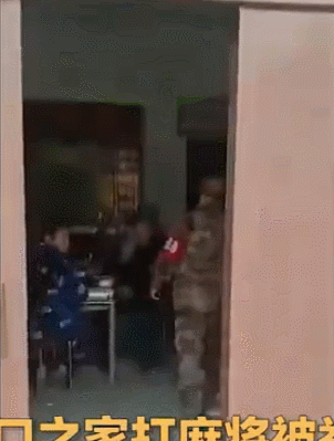 视频中,一家三口正围坐一桌,其乐融融打着麻将,突然冲进来一个气势汹汹的“红袖章”,二话不说拿起桌上的麻将就摔。