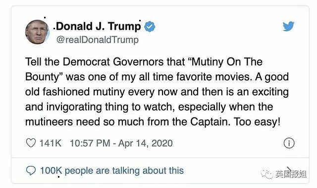 (图:《叛舰喋血记》) 这条推可以说一石激起千层浪。 本来各州也只是合作,没人说要独立。加州、德州的确也有独立运动,但都完全不成气候,只是小打小闹而已。 但川普却直接给他们按了一个“叛变”的帽子,下一步要怎么做?武力占领民主党州吗? 不知道美国能不能上演叛舰喋血记2020,几个州长把川普轰下台吧… |