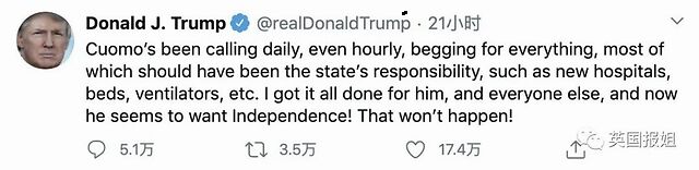 你们私下里搞小团体,联邦政府会怎么想?华盛顿会怎么想?美国宪法又会怎么想? 最重要的是,川普会怎么想? 川普发推了: “纽约州州长科莫每天,每时都在给我打电话,求我要物资。这些都应该是州政府的职责,比如新医院,病床,呼吸机。我什么都给他了,而现在他竟然想要搞独立!我不会让这样的事情发生!”