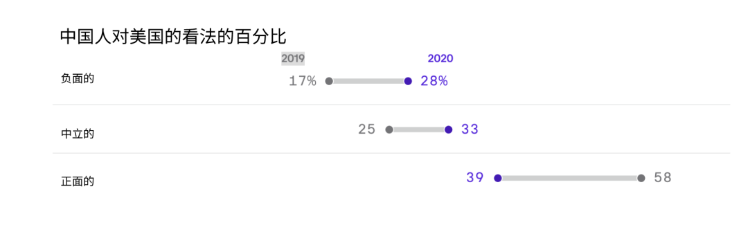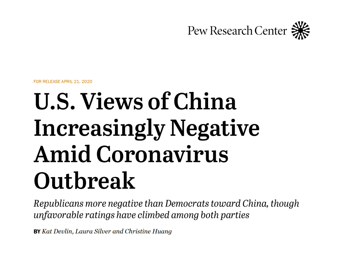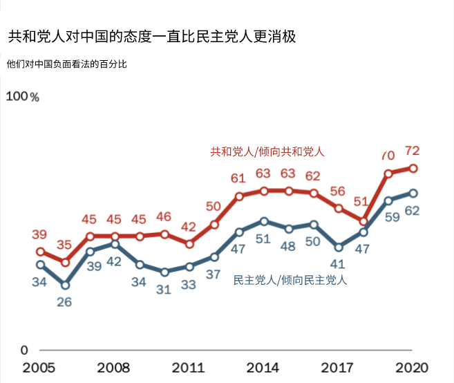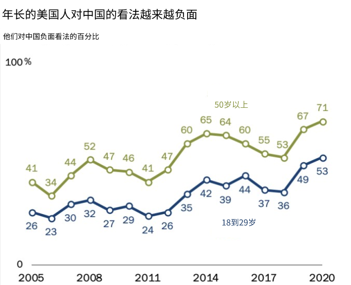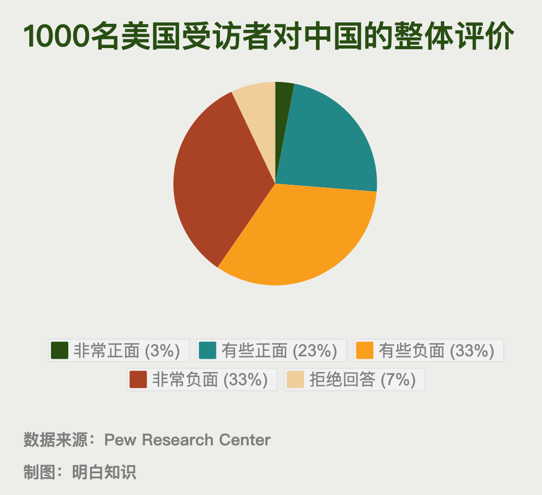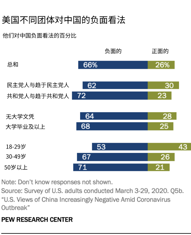 美国有一个非常有名的调查机构,皮尤研究中心(Pew Research Center),从2005年开始,每年调查一次美国人对中国的看法。 迄今已经15年了。 今年的调查,是在美国疫情爆发期间开始的,照例出了一份报告,结论很惊人: (1)美国人对中国的负面看法,已到历史最高点。1000个受访的普通美国人,对中国持负面看法的比例到了66%;而且,不管年长年幼、不管民主党还是共和党,不管收入高还是低,不管受没受过大学教育,对中国恶感的,都超过了一半,同时还在继续恶化。 (2)按年龄分,越年长越对中国观感不好。 (3)按党派分,共和党对中国的恶感超过了民主党。当然,两党对中国的恶感都超过了60%,他们之间的差别其实只是恶感与更恶感的区别。 这份报告4月21日发布,全文标题为:《新冠疫情期间,美国对中国负面观感的增长情况》(U.S. Views of China Increasingly Negative Amid Coronavirus)。 皮尤研究中心发布的调查封面。 报告全文信息非常丰富,建议细细阅读原文。 一些细节如下: 从2020年3月3日到3月29日,皮尤研究中心对1000名美国成年人进行代表性调查,询问公众对中国的看法。 调查内容很足,挑几个重点来看,在这些受访者中: (1)整体而言,约66%的人对中国持负面看法,持正面看法的占26%; 1000名美国受访者对中国的整体评价。 数据来源:Pew Research Center 制图:明白知识 (2)按年龄划分,50岁以上对中国持负面看法的占71%,18-29岁的年轻人占53%; (3)按党派划分,共和党人中,72%的人对中国持负面看法;民主党人中则占62%; (4)按收入划分,年收入5万美元以下者,对中国持负面看法的占63%;年收入5万美元以上者,对中国持负面看法的占53%。 (5)按受教育程度划分,受过高等教育者与未受高等教育者对中国的负面看法比例相近,分别为68%和64%。 不同党派、受教育程度、年龄段的的受访者对中国的不同评价。 数据来源:Pew Research Center 可以看出,不管是总体情况,还是按照年龄、党派、收入,还是教育程度来划分,受访美国人中对中国持负面看法的人都超过半数。 皮尤研究中心自2005年开始,每年都会进行此项调查。今年的调查结果显示,美国人对中国持负面看法的比例,达到历年最高。 来看看调查结果走向: (1)2006年是受访者对中国好感度最高的一次,持负面看法者仅占29%; 2005年-2020年历年调查整体评价比例的变化。 图片来源:Pew Research Center (2)2017年,川普执政以来,对中国的负面看法从47%升至66%,上升了近20%; (3)从2005年到2020年,共和党人对中国的负面看法比例每年均高于民主党人。2018年至2020年,两党对中国的负面看法比例都在增加,共和党速度更快; 2005年-2020年(亲)共和党与(亲)民主党受访者对中国评价的变化。 图片来源:Pew Research Center (4)从2005年到2020年,50岁以上的人对中国持负面看法比例均高于18-29岁的年轻人; 2005年-2020年不同年龄段受访者对中国评价的变化。 图片来源:Pew Research Center (5)从2014年开始,更多受访者认为相比于中国,美国更适合作为世界经济的领导力量。 这意味着什么? 因为疫情而影响美国人对中国的看法? 这份报告的负责人之一凯特·戴维林(Kat Devlin) 在接受采访时称,这次疫情对美国人看待中国的态度,影响并不大。 美国人更为关心的仍然是经济问题,比如在这次调查中,约90%的受访者将中国的崛起视为一种威胁。 如果是这样,那意味着这份报告里还含着中美两国之间更根本性的冲突。 很自然的,我们会反过来想,美国人越来越对中国有恶感,那反过来呢? 中国人对美国的观感呢? 来看另一份民意调查。 欧亚集团基金会(Eurasia Group Foundation)在4月初发布了一项调查报告,根据2019年10月对410名中国成年人的调查,以及2020年2月15日至3月3日对730名中国成年人的调查,结果显示: 对美国持负面看法的人从2019年的19%升至28%,持正面看法的人从58%降至39%。 欧亚集团基金会关于中国人对美国评价的调查结果。 数据来源:Eurasia Group Foundation 图片来源:Axios 中美之间,不知不觉间,已经到了这样一个阶段:不仅贸易冲突、政策冲突,两国民众之间也开始越来越互怀恶意。 曾经唇齿相依的亲密格局会就此消失吗? 疫情之后的世界,已经站在了一个历史的十字路口。 |