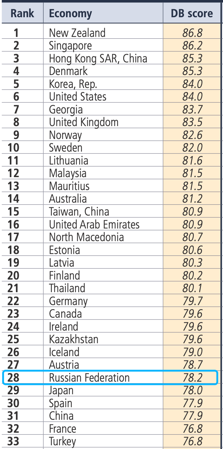 在世界银行和国际金融公司发布的《2020年全球营商环境报告》中,俄罗斯已经升至第28位,排名甚至高于中国。而俄罗斯2012年营商环境排名为120位。