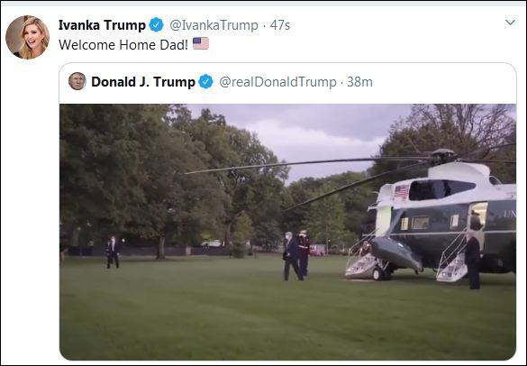 一个视频是他乘坐专机降落白宫的画面,配上了雄壮的音乐。女儿伊万卡很快转发:“欢迎回家,爸爸。”