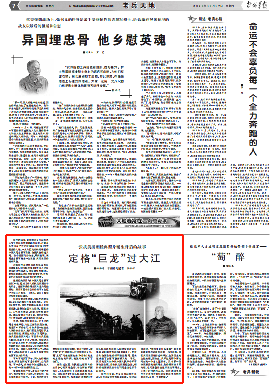 望着那军容严整、逶迤过江的“铁流”,黎民突然来了灵感,想要抓拍一幅全景式的过江照片。于是,黎民将镜头对准如巨龙般蜿蜒前行的过江队伍,就在那“龙头”刚刚探入对岸朝鲜新义州,而“龙尾”尚在祖国安东(今丹东)的土地上逶迤的瞬间,他激动地按下了快门。