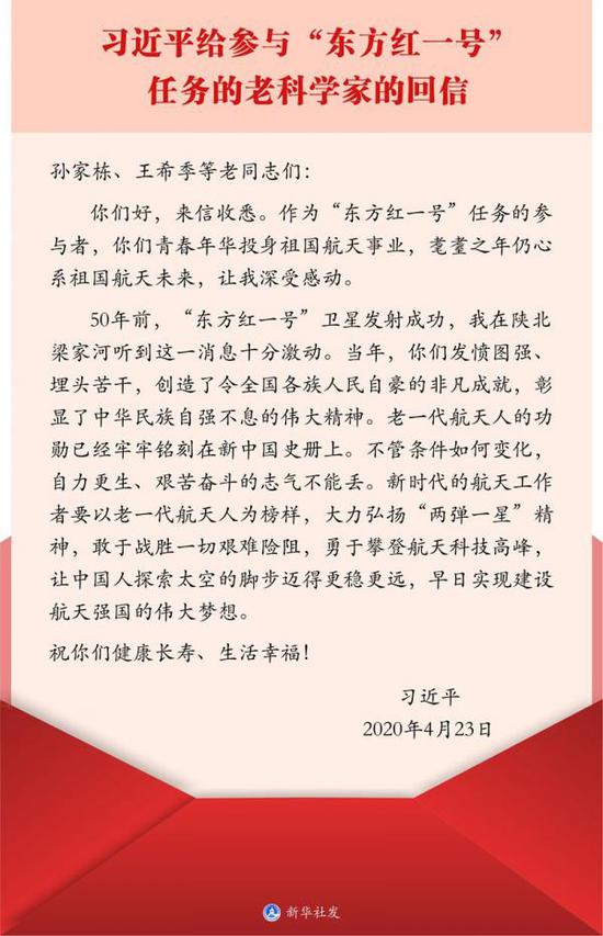2020年4月24日,新华社刊发了习近平给参与“东方红一号”任务的老科学家的回信。