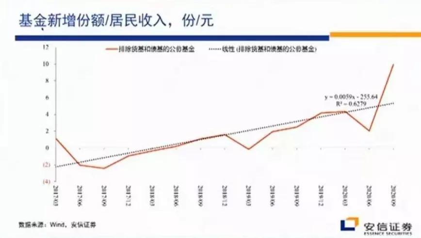 我们看到二、三季度相对于正常条件下,居民把2~4个百分点甚至更多一点的收入挪到了住房市场上,即使到四季度,居民用于购房的开支跟正常条件相比,差不多仍然要高出2个百分点。 在正常条件下,每年二、三四季度居民都是买房子的,但是在2020年的二、三、四季度,他比正常水平拿出更多的收入来买房子。 这个行为也许有助于我们在资金底层层面上去理解房地产市场的变化。 风险资产之基金 公募基金配置显著提升 我们再看另外一个重要的变化。 剔除掉货币基金和债券基金以后,居民在我们所能够看到的公募基金市场上购买的变化。 为了控制一些数据上的影响,我们的这一计算分成两个部分: 第一个部分我们计算了居民购买公募基金的份额变化, 第二部分我们计算他购买公募基金的资金量的变化,这是为了控制公募基金净值变化做的一些技术处理。然后这两个结果基本上是非常接近的。 可以看得很清楚,进入三季度以后,相对于正常情况,居民显著把更多资金配置到了公募基金,配置到了股票市场。