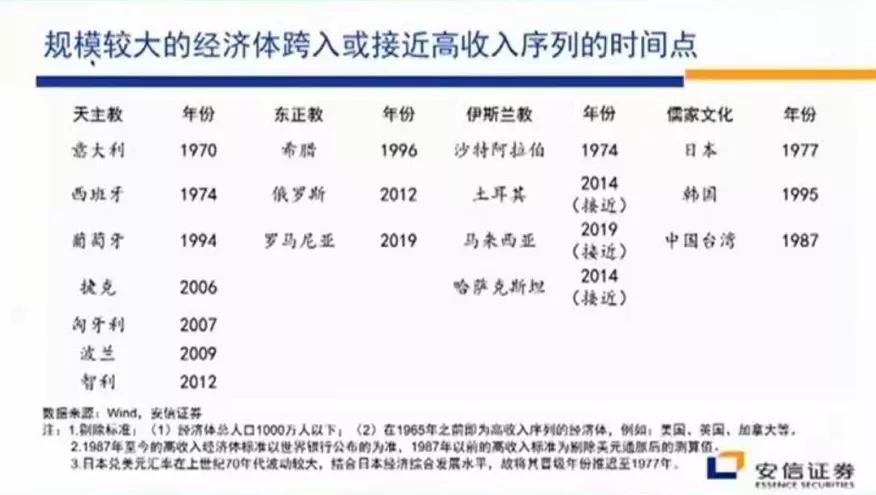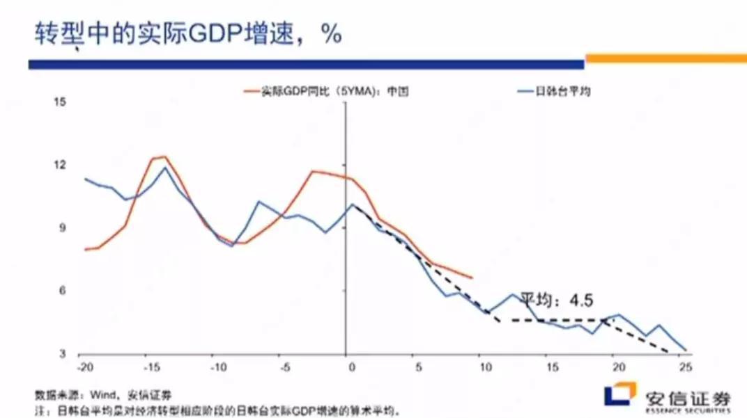 以此为基础,我们想说的是,尽管疫情尽头的亮光已经清晰可见,但在比较长的一段时间里,预防性储蓄都不会很快恢复到0。 这意味着,我们在2020年下半年所经历的,刚才我们所描述的一些资产市场所经历的变化,在一段时间里还会继续维持,也许这段时间涨的是周期股,那段时间涨的是成长股或者是新能源。 但从资金流动和配置的角度来讲,相对更多的资金在流入市场。 即使我们走出了隧道,一段时间这个局面都可能继续维持,只是它的力量相对下降,但在贡献的方向上,它仍然有正的、积极的贡献。 足够长时间后上述过程可能反向再走一遍 持续追踪居民储蓄行为的变化非常有意义 第二个重要的提示,同样以2003年北京城镇居民储蓄行为的模式来看,在走出隧道足够长时间以后,有可能发生一个反向预防性储蓄的下降。 如果我们认为这一历史模式在2021年、2022年的某个时候会发生,也许2021年夏季,我们彻底走出了新冠疫情,也许在2022年的某个时候,我们出现了预防性储蓄的反向下降和补偿,进而就会导致经济在一段时间之内很快加速,快速加速进一步会诱发货币政策的加速紧缩。 如果发生了这件事情,我们刚才花很大精力所描述的逻辑,就会反向再走一遍。 我们刚才描述的是,很多资金增加了,储蓄流入了风险资产市场带来了风险资产的上涨。 那么未来,随着预防性储蓄的下降和货币政策相对应的紧缩,会有很多的资金流出市场,至少在估值层面上,市场又会经历一轮比较严重的、持续时间相对比较长的下跌。 同样以北京城镇居民当时的模式为基础,这种情况会发生在我们走出隧道比较长的一段时间以后。 假设2021年6月份我们走出隧道,它并不意味着2021年6月份,这种情况就会立即发生。 实际上,我们走出隧道一段时间以后,因为居民户部门还是心有余悸,所以它的预防性储蓄多多少少仍是存在的,企业部门的风险回避行为也多多少少仍然是存在的。 我们刚才所描述的力量在下降,但它还不至于很快变成一个反向的力量。 在我们走出隧道足够长时间以后,用中国人的话来讲,人最终一定是好了伤疤忘了疼。 当我们在高速公路上亲眼目睹一起事故发生以后,在一段时间以内,我们会降低车速和非常小心,但过了足够时间长的时间后,基本上你是该干什么干什么,继续保持很高的速度,继续习惯性做一些比较危险的动作。 这种情况是否会发生?北京当时的模式是否一定能够具有借鉴意义?我们要拭目以待。 但是从人性的角度来讲,这种可能性是不能忽略的。 同样,我们要提示的是,这种情况即使在未来发生,它不会是一个迫在眉睫的事情, 不会在我们控制住疫情的时候,它会发生在我们“好了伤疤忘了疼”的时候,它会发生在我们普遍的都已经忘记了这一场疫情,对未来不再恐惧和担心的时候。 这意味着,离我们现在的时间点上,还相对比较遥远,但毫无疑问,未来持续去追踪居民储蓄行为的变化,对我们去理解未来可能发生的一些趋势反转,会非常有意义。 这个是我们今天第一部分想讨论的主题。 总结而言就是,面对巨大的不确定性,人类经济行为发生了很多变化,我们选取了人类经济行为发生变化的一个重要方面,就是预防性储蓄的变化。 我们考察了预防性的储蓄流向了哪里,并且随着局势的变化,它是在如何在不同的资产市场上重新配置的。 在这个背景下,解释了一些重要的宏观经济的数据,也在资金流动的角度和层面上,试图去解释资产市场变化的一些重要方面和特征。 并且基于北京在2003年前后,居民户行为的变化模式,我们对2021年乃至更长一段时间的一些趋势做了一些原则性展望。 我们特别提示的是,刚刚走出隧道的时候,我们仍然是比较安全的;但当我们离隧道口足够远的时候,当我们已经忘记疫情所带来的创伤的时候,当储蓄开始下降,消费行为重新开始出现一个补偿性上升的时候,资产市场在那个时候会处在一个相对比较危险的境地。 只是说,这种情况是否一定发生?我们不知道,这种情况发生在什么时候?我们也不知道,但它的出现概率至少是不可忽略的,而且它出现的时间,相对2021年的现在来讲,会比较晚。 在东亚经济体的背景下 合理的经济增速几乎只取决于人均收入水平 接下来我们想跟大家讨论的问题是,在这个背景下,我们想对走向2035年的中国经济提供一个相对更全景化跟数值化的预测,我们也会把这个预测放在全球更开阔的背景下,做一个简要的讨论。 在一年前的策略会上,我们曾经对2020-2030年,中国经济的基本情况做过一个描述。当时我们把中国放在东亚经济体的背景下,与日本、韩国和中国台湾地区的情况进行对标,具体的对标,我们也使用了很多的指标。 基本的结果是,我们当时认为,2010年的中国相当于1968年的日本,1991年的韩国,1987年的中国台湾地区。 在这一背景下,我们把对标年份设为0年,把数据向前和向后各延伸25年,然后把各个国家的经济增速都放在坐标轴上,为了剔除个别国家地区、个别年份数据所经历的扰动,我们把对标国家地区的数据进行了平均。