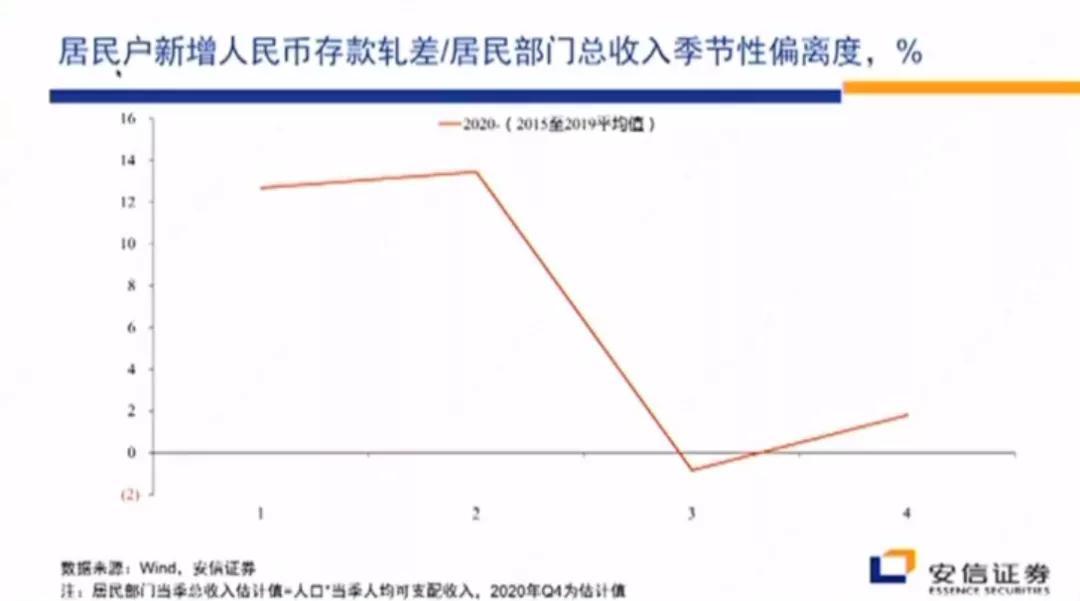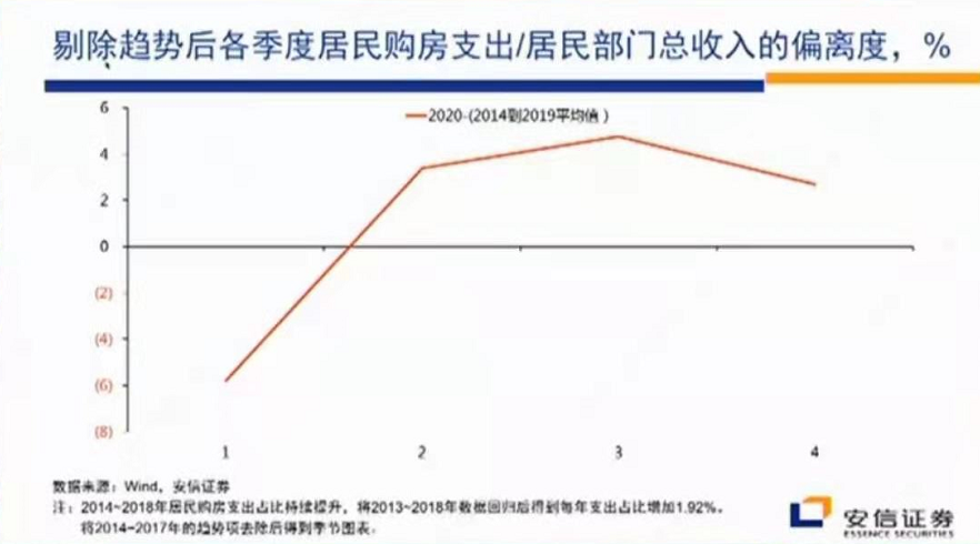 我们计算了每个季度居民在银行体系所增加的人民币存款,当然每个季度存了多少钱是相对收入而言的毫无疑问,在2020年,至少在2020年上半年,居民部门的存款增加异常多。 然后,我们可以计算出在历史上正常时期,每个季度居民应该把多少存款存入银行; 我们把2020年每个季度居民在银行体系存了多少钱这个数据扣减掉居民在银行体系增加存款行为的正常模式,就可以得到一个居民存款的异常模式,也就是相对历史上的正常情况,你在银行体系的存款是多了还是少了。 这张图上我们看得非常清楚,在2020年一、二季度,居民提供给银行体系的存款相对正常水平有特别大幅度的上升。 拿二季度最极端的情况来看,他们提供给银行体系的存款相对正常水平至少上升了12个百分点,在一季度这一比例也接近12个百分点。 所以我们可以模糊的说,2020年上半年增加的储蓄,很多去了银行,表现为银行存款(增加)。 实际上银行存款还有一个替代品,我们认为就是货币基金,货币基金在很大程度上因为有(一定)安全性,可以理解为银行存款的一个替代。 以几乎相同的方法来计算,我们看到2020年一季度,相对正常条件下,货币基金的新增规模也异常的大。 所以,钱去了哪里呢?至少2020年上半年,很大一部分钱都留在了银行存款。 存款的上升幅度为什么高于预防性储蓄? 居民同时还减少了风险资产的配置 如果我们进一步去细究,这个问题里边有两个重要的细节需要想一想。 第一个重要的细节,就是居民的收入和开支行为。 我们发现,在2020年上半年,居民预防性储蓄的上升接近6个百分点,到了三季度仍然有3个百分点。 但是,如果去研究居民的存款,我们会发现,它的上升幅度有12个百分点。 也就是说,存款的上升幅度要高于预防性储蓄的上升幅度。 问题就来了,这中间的6个百分点是从哪里来的呢? 进一步检查数据,我们会发现:因为居民减少了在其他领域的资产配置,比如说减少了对住房的购买。 举一个例子,我们计算了居民的对住房的购买行为,明显看到相对正常情况下,2020年一季度居民住房的购买,以收入为基础减少了6个百分点。 所以,对银行体系存款的增加超过了预防性储蓄的上升,而且超过幅度比较大,是因为在增加预防性储蓄的同时,他们减少了自身直接投资的行为,减少了住房的购买,减少了在股票市场上的配置,减少了在其他资产类别的配置。 这些行为共同导致存款的上升要明显高于在经济端预防性储蓄的上升。 疫情控制住后风险偏好提升 资金又从存款流向风险资产 而且显著高于正常水平 换句话来讲,2020年上半年,面对新冠疫情所造成的巨大不确定性,人们出现了非常强的回避风险的行为。 在消费端,表现为减少消费增加储蓄,从而导致预防性储蓄上升了6个百分点; 在资产配置端,面对不确定性要降低自己的风险暴露,所以大量增持现金、增持货币基金、增持银行存款; 为了做这种增持,他们还系统性减少了其他风险资产的暴露,包括住房,包括股票,包括居民的直接投资,一定程度上也包括境外资产的配置等等。 从存款的角度来看,其他资产配置的减少量,如果以居民收入为基础,差不多有6个百分点; 而消费行为的减少所导致的储蓄上升,也差不多有6个百分点。这2个6%合并起来解释了居民存款的上升要超过12个百分点。 我们把实体端交易行为与金融市场联系起来,集中观察2020年上半年,这是我们所看到的变化。 如果看未来,在实物交易端,三季度储蓄率仍然要高出3个百分点,在四季度很可能也明显要高一些,不见得有3个百分点。 但是在存款这一端,相对历史上正常的模式已经看不到特别明显的差异了。 我们看到存款在三季度基本上就恢复正常了,四季度有一些轻微的上升,这还只是一个估计值; 但是毫无疑问,也还是处在一个非常低的水平,比如只有一两个百分点。如果我们去观察货币基金,在三季度就已经完全恢复正常。 我们认为,最重要的变化是,中国在进入三季度以后,疫情很大程度上得到了控制,社会经济生活在逐步恢复正常,人们的社交行为在一定程度上恢复正常,在实物交易端表现为预防性储蓄的下降,从6%下降到3%。 也许四季度仍然有2%,相对正常水平仍然是明显高的,但是随着风险降低,人们预防性储蓄下降,在实体经济层面会表现为经济很强劲的恢复。 变化的另外一方面,在居民的资产配置上,他们在把资产从人民币存款、从货币基金转向其他的风险性资产,比如股票,比如房地产,比如个体户生产经营行为所导致的实物投资,所以,在存款市场基本上已经恢复正常了。 既然存款市场恢复正常,随着人们风险偏好的恢复,这是不是意味着在风险资产市场上,资金的流入跟以前会是一样的? 实际上不是的。 在风险资产市场上,资金的流入跟正常水平相比,显著更高了。 为什么? 因为三、四季度人们至少还有3个百分点的预防性储蓄没有流入存款市场和货币基金,它流向哪里了呢? 流向了股票市场,流向了房地产市场,在一定程度上流向了居民自己所从事的一些直接投资行为。 风险资产之房地产 购房开支显著高于正常水平 接着看一看数据。 这是我们直接能够计算出来的,居民部门跟正常趋势相比,在购房层面上所表现出来的异常行为。