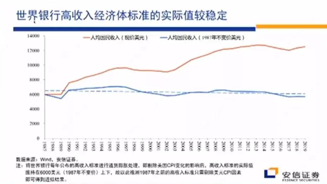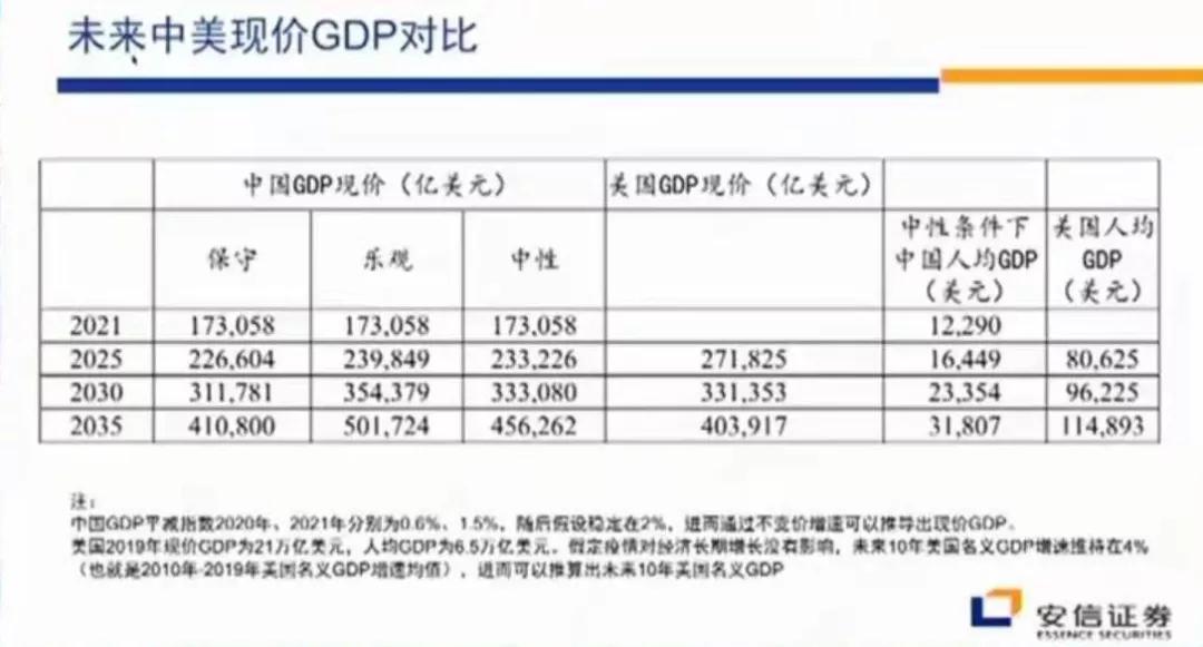 中性情形是我们认为的大概率情形。 保守情形是以这一模式为基础,我们认为对中国而言一定会做到的,在这些保守情形下,我们进一步留了一些余量。 乐观情形是以这一历史模式为基础,我们认为因为各种各样的原因,中国会比这些模式表现的更好,我们尽量向乐观方向去调整一些假设,从而得到一个乐观情形的数值结果。 我们把这几个结果都放在这个表上做一个具体的报告,作为对比,我们把美国的GDP的现价,美国的以及中国的人均GDP,以美元为基础都做了一些报告。 节点一 最快2021年,最慢2022年 中国会跨入高收入国家门槛 对于这一结果,我们要讨论几个节点: 第一个节点,以我们的估计为基础,快就是2021年,慢是2022年,中国就会跨越高收入国家门槛,正式进入高收入国家的行列。 这一结果比大多数人的估计和认定的结果要明显更早,此前普遍的看法是中国在2025年会跨越高收入国家的门槛。 但根据我们的计算,存在一定的可能性,在2021年,我们就会跨越高收入国家的门槛,但即便2021年我们没有跨越门槛,我们离这个门槛也会非常近,但在2022年,几乎非常确定的,我们会跨越高收入国家的门槛。 从1979年改革开放开始,中国从一个一穷二白的低收入国家,经过40多年的努力,连续的增长,成功跨越高收入国家的门槛。从任何角度来讲,这都是一个特别了不起的成绩。 从中国人自己的语境下来理解,什么叫高收入国家的门槛? 从两个角度来理解: 一个角度,这就是我们所定义的全面小康。 很多年以前,我们定义要在2020年实现全面小康,在2021年,我们要宣布取得了全面小康的决定性胜利,但也是在这个时候,我们看到中国跨过了高收入国家的门槛。 换个角度来讲,所谓的高收入国家门槛,在中国人的语境的定义下,就是我们的全面小康。 另一个角度,所谓的高收入国家的门槛就是,别人觉得你有钱了,自己觉得自己没钱,这个就是(刚跨入)高收入国家。如果别人觉得你有钱了,自己也觉得自己有钱,这个就已经是在高收入国家里待了很长的时间。 当我们刚刚跨越高收入国家门槛的时候,回头看一看,我们很多农民的人均收入还这么低,好多人月均收入不到3000块钱,但在统计数据上,我们已经是一个高收入国家了,别人觉得你有钱了,自己觉得自己没钱。 节点二 中性情景假设下 2030年中国GDP总量会超过美国 第二个,在中性的情景假设下,2030年的时候,中国GDP总量会超过美国。 我们认为,在2030年的时候,中国GDP总量可能会超过33万亿美金,美国GDP总量也会在这个区间附近,但是会低于这一水平。 有一些乐观的估计,认为2028年就有可能实现这一追赶和超越。我们也不否认这种可能性,但是我们认为,2030年是一个中性的估计,在最保守的情景下,2035年中国市价计算的GDP总量也会超过美国。 在最保守的情形下,2035年中国GDP的现价总量会在41万亿美金,美国在那个时候不会超过40万亿美金,在那个时候中国的GDP总量也一定会超过美国。 所以在走向2035年的中国经济,将是我们正式跨入高收入国家的时代,也是中国的GDP总量比较确定超过美国的15年。 中国GDP总量超过美国,从很多层面上来看,毫无疑问会产生非常重大的影响。 非常公平客观地说,即使中国的人均GDP总量在2030年超过了美国,那个时候中国的人均GDP也只有23,000美金,美国的人均GDP接近10万亿美金,中国只有美国的1/4,在人均收入水平上,我们仍然有非常大的差距。 但尽管如此,由于总量非常确定的超越,而且这一超越后,在很长的时间里,在可以预见的非常长的时间里边,中国都会始终维持全球第一大经济体的位置。 由此带来的心理上的冲击,包括对于世界经济格局,世界经济秩序的影响,都将是非常深远的。 这也将是19世纪末期美国成为世界第一大经济体以来,世界经济格局所发生的一次非常重大的影响深远的变化。 我们现在知道的国际经济秩序和国际经济规则是在第二次世界大战的背景下,以美国的利益为中心和基础、以美国的价值观为中心和基础建立起来的。 但是随着中国超越美国成为世界第一大经济体,国际经济秩序和国际经济规则在很多层面上会不可避免的经历调整,这些调整毫无疑问会有非常广泛的影响。 我在这里只举一个具有八卦意义的价值。 第二次世界大战以后的国际经济秩序有一系列的支柱,其中国际货币基金组织的创立和存在是重要的支柱之一。 在国际货币基金组织的章程之中,我们有查阅过,这些情况应该是比较确定的。根据美国人当初对这一章程的设定,这一章程明确规定,国际货币基金组织的总部设在世界第一大经济体,这是因为1945年的美国经济总量占全球的接近一半,也许还多一些。 当时的美国无法想象未来会存在经济总量比美国还要大的经济体。 所以它在设定章程的时候没有明确的规定说,国际货币基金组织的总部必须设在华盛顿,它规定必须设在世界第一大经济体,因为它没法想象会出现一些其他的情形。 但是到2035年,就是不到100年甚至不到90年,这种情况出现了。 这种情况出现的话,要么就需要修改章程,要么就需要去搬迁。 我们在这里只是举了一个很小的例子,通过这个很小的例子我们想说的是,国际经济规则和国际经济秩序反映了美国的利益和价值观,但是随着局势的变化这些情况势必要经历很多的调整。 跨越高收入国家是什么样的概念? 先看看什么是高收入国家门槛 接下来把话题转入另外一个跟