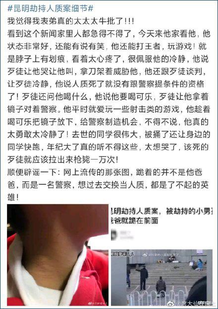 中美“跪下的警察”火了 一张对比照刷屏(图)中美“跪下的警察”火了 [文/观察者网 鞠峰] 今天(24日),云南昆明被劫持孩子的家属发声:现场下跪的不是孩子的父亲,而是民警,当时正与劫匪协商替换人质。 在整个事件中,请求替孩子做人质而下跪的人民警察、被砍伤还让同学们快跑的去世的小朋友、刀架在脖子上还冷静跟劫匪周旋的孩子、挺身而出拖延时间的女记者……一次次戳中网友们的泪点。 中央政法委网站@中国长安网24日发声“中国警察vs美国警察”,侧面证实了下跪男子警察的身份,也让许多人联想到去年5月,美国黑人男子弗洛伊德被白人警察“跪杀”致死的事件。 观察者网发现,一张中英文的“中美警察对比”图,名为“跪下的警察”(Police on their knees),已经传到了国外社交媒体上。 ![]() 视频截图 被劫持孩子表姐:下跪男子是人民警察 23日,天目新闻记者采访到被劫持孩子的表姐。她澄清,“视频里这名跪地男子为出警民警,正在和劫匪协商替换人质,并非孩子父亲。” 据这名孩子表姐介绍,“现场警察向劫匪喊话愿意替换孩子,自己来做人质,为了证明其身上没有携带武器,还在现场脱了衣服”,但是孩子向这名警察摆摆手,示意不要过来。 社交媒体上流传着那名警察脱去外衣的现场照片。网友评论道,“不光是冷啊,大庭广众下,谁愿意脱成那样?”“但为了人质,他们什么都不在乎了。” ![]() 微博截图 与之形成鲜明对比的,是一名叫德里克·肖万(Derek Chauvin)的美国明尼苏达州警察。 去年5月25日,他在逮捕黑人弗洛伊德的过程中,长时间压迫其颈部,致人死亡,又一次揭开了美国系统性种族歧视的“烂疮”。此后,美国多地爆发“黑人的命也是命”(BLM)反种族歧视游行。 ![]() 事件当天,不止一名警察对弗洛伊德实施“跪杀”(视频截图) ![]() “中国长安网”在官方微博发出中美两国警察的对比图,配文“中国警察VS美国警察”、“同样的姿势,不同的国家” 从凌晨开始,#跪下的警察#这一话题引发大量的讨论。 这就是为什么我们的警察叫做“人民警察”,人民警察“真的为人民服务”。 ![]() ![]() 还有网友对“人民警察”的来源和含义做了科普:因为“我们的公安队伍来自于人民,服务与人民,人民公安为人民”。 顺便一提,“人民公安为人民”这句话也被写入了中国人民警察警歌中。 ![]() “明明警察不是被劫男孩的父亲,为什么也会跪地请求用自己去替换人质”?有人引述影视作品的台词,探讨执法人员愿意舍身换人质的初衷和意义。 ![]() 不过也有网民认为这种比较不妥,“不能拿我们最好的警察和他们最坏的比”。 @西北野战军 还将他们的事迹与劣迹翻译成英文,这张图已经出现在国外的社交媒体上。 ![]() 图源见水印 理智的孩子,勇敢的记者……“大家都好棒” 2021年1月22日17时许,一名男子在昆明市云南师范大学附属实验中学门口持刀致伤7人后,劫持1名人质。据昆明市公安局通报,现场处置特警果断开枪击毙犯罪嫌疑人,安全解救人质,嫌疑人王某侠的犯罪行为已造成1人死亡、7人不同程度受伤。 随着媒体的跟进报道,案件中的细节触动了无数网友。 被劫持孩子的表姐向天目新闻透露,劫匪拿刀架着孩子脖子威胁他,让他哭喊,但孩子理智地跟劫匪谈判,让他冷静下来,孩子在现场还告诉劫匪“人质死了,你就没有跟警察提条件的资格了!” 另外,这名孩子回应了被劫持现场喝可乐的原因。他说,现场劫匪问他喝什么,他说要喝可乐,当时原本劫匪让他拿着镜子对着警察,影响警察的光线。“他平时就爱玩一些射击类的游戏,于是趁着喝可乐把镜子放下,给警察制造瞄准的机会。”其表姐告诉天目新闻记者。 向孩子和歹徒递送可乐的蓝衣女子,不是此前外界猜测的“谈判专家”,而是一名记者。当天,她刚刚拿到记者证。 ![]() 视频截图 云南广播电视台都市频道发布消息,当时距嫌犯3米的蓝衣女子是该单位都市条形码记者。劫匪要求见记者,而且必须是女记者,只给10分钟时间,当天刚领到记者证的她勇敢站出来上前。 来自云南记协的消息显示,在对峙过程中,该名女记者起到很大作用,她不停与劫匪说话,稳定劫匪情绪,给后面的特警创造处置机会。 1月23日上午,当事的蓝衣女记者对媒体表示,“我现在很好,谢谢关心。” 被劫持孩子表姐还在网上发布了更多的案件细节。表姐称,去世的同学很伟大,受害时还呼喊着让身边的同学快跑。 ![]() 目前,伤员救治、案件调查、家属安抚等工作正在开展中。事发后学校已安排心理疏导。不断有市民买来鲜花、蜡烛,悼念遇害离世的孩子。 ![]() 刚刚过去的2021年1月10日,是我国第一个“中国人民警察节”,1月10日对应着报警电话“110”。全国各地无数的民警们,冲在打击违法犯罪,维护社会治安的第一线,用行动书写这份职业中“人民”两个字的含义。 |
