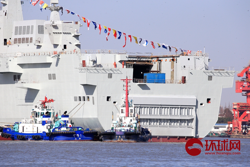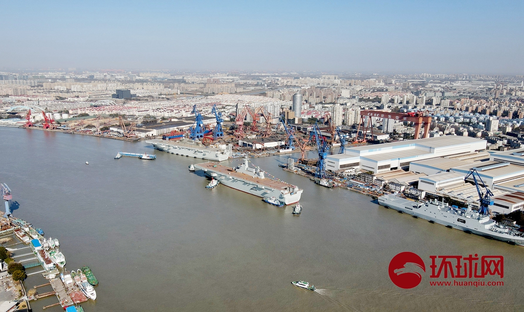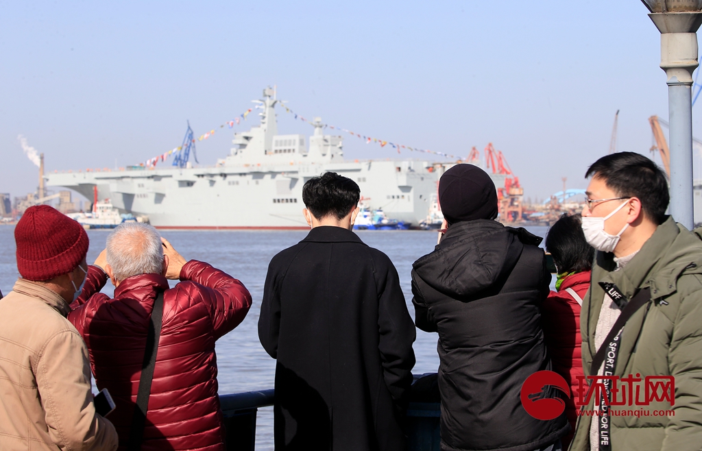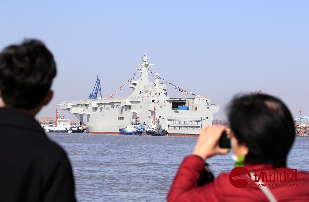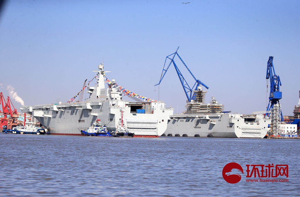今天下午在上海沪东中华造船厂,第三艘075两栖攻击舰缓缓下水靠在岸边,和第二艘075并排在黄浦江边继续进行施工,很多军事爱好者前来观看下水,目前,我们可以看到两艘075在江边并排施工的壮观景象。环球时报-环球网 杨辉/摄