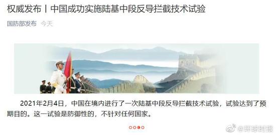 中国成功实施陆基中段反导拦截技术试验原标题:权威发布丨中国成功实施陆基中段反导拦截技术试验 ![]() 2021年2月4日,中国在境内进行了一次陆基中段反导拦截技术试验,试验达到了预期目的。这一试验是防御性的,不针对任何国家。 |