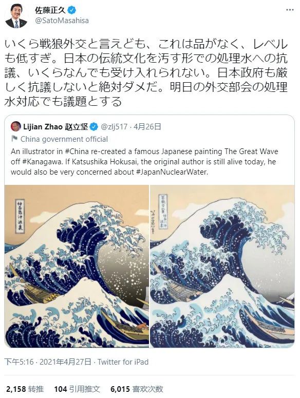 日本外务副大臣看到中国网友这幅画,急了!原标题:日本外务副大臣看到中国网友这幅画,急了! 葛饰北斋试图传递的“大无畏”精神,却在日本政府这变了味儿。 4月27日,面对赵立坚在推特上po出的中国网友画作《神奈氚冲浪里》,日本外务副大臣佐藤正久急了。 他表示:“再怎么样的‘战狼外交’,这种形式也太低级了。以污染日本传统文化的方式来表达对处理核废水的抗议,无论如何都是不可接受的。日本政府也必须提出严正抗议。” ![]() ![]() 《神奈川冲浪里》是日本画家葛饰北斋在19世纪初创作的一幅彩色浮世绘作品。画作中,日本神奈川附近海域波涛汹涌,波浪中有三条奋进的船只,英勇的船员们正为了生存而与大自然搏斗,整幅画表现了人们无惧艰难险阻,勇往直前的大无畏精神。 如今,葛饰北斋试图传递的“大无畏”精神,却在日本政府这变了味儿。他们无视全球海洋生态环境和全人类健康安全,无惧人们的担忧和抗议,“勇往直前”最终沦落成“一意孤行”。 |