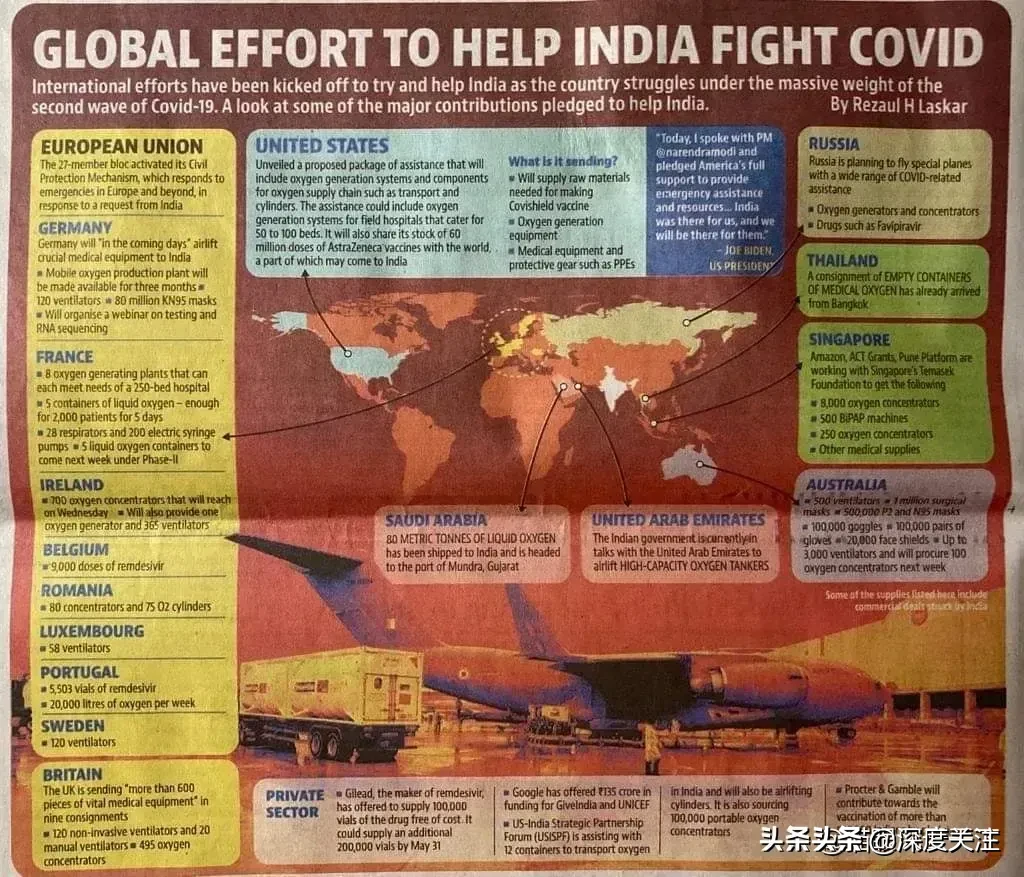 今天印度报纸上刊登的援助的国家清单和援助项目!没有中国!我们只卖不捐,没毛病! 这份清单,美国和欧盟毫无例外的排在最显眼的位置,然后是俄罗斯,泰国,新加坡,澳大利亚,阿联酋和沙特阿拉伯等等,反正只字没提中国! 不提就不提吧,也没什么!卖了几万台呼吸机,只要拿到钱,其他什么都不重要,既然我们是做生意,说不说都无所谓,能赚钱就行,名利双收好像也合适吧!他们要什么我们把货物卖给他,价钱合理就行,都动手打架了,还能做到这一步,不容易了。 小编点评:如果印度没有请求,绝不可以做主动援助他,因为一旦那样做了,人家不但不会感激,还有可能因为质量问题,遭遇日后的巨额索赔。 |