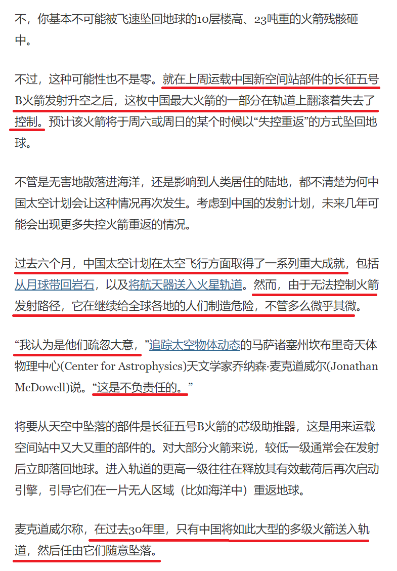 【长征5号B发射“天和”核心舱,我们到底成功了没有?】 如果你先看到这则新闻的导读:“运载中国新空间站部件的长征五号B火箭上周发射升空后,在轨道上翻滚并失控。预计这枚中国最大火箭的残骸周末将坠回地球。事件引发了外界对中国太空计划的质疑。” 恐怕会很自然地得出“中国发射失败”的结论! 但这说的压根与我们的发射的“天和”核心舱没有半毛钱关系! 看截图中的红线语句,除了枉顾事实的指责,就是对中国航天成就的不屑! 不管他们了,随他们去! 反正以后他们要上我们的空间站,是要先学会中文的! #西方为长征五号“发明”航天新词# #天和核心舱发射# #炒作中国长征5号火箭残骸,美国计划将其击落?# |