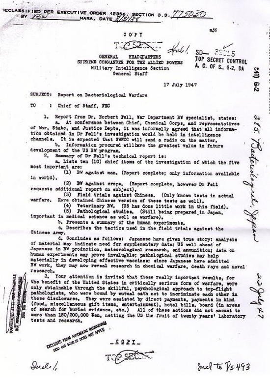 三份731细菌战文件曝光 解密美军德特里克堡生化基地文/黄绒特约撰稿员 来源:CC情报局 编者按: 世卫会议期间,美国媒体援引一份来源不明的情报,称武汉病毒研究所三名工作人员在2019年11月患病并送院治疗,引起中美两国激烈交锋。中国外交部发言人赵立坚称,世卫赴中国研究后公布的报告已经清楚表明,病毒从武汉P4实验室外泄的说法不可信。 6月2日,中国媒体发表关于中国民众中英文公开信,呼吁世卫组织调查美军德特里克堡生物实验室。对此,中国外交部发言人汪文斌表示,这反映了中国民众的心声。 ![]() 5月31日,网络上一则“人体70%是水”是“日军731部队把活的中国人蒸干得出的结论”的帖文,引发网友关注登上热搜,使神秘的充满争议的德特里克堡基地与731的关系再次浮出水面。中方多次呼吁美公布德特里克堡军事基地真相,那里到底发生了什么?幕后真相究竟为何? 凤凰网肿瘤情报局继2020年4月独家推出《20年100多起安全事故 揭密美国生化试验病毒泄露幕后》的调查报道后,对这家掩藏着大量密秘的美军生化基地再度进行了调查,首次揭密了美军全盘接收日军731细菌部队密秘档案、特赦731核心战犯、将其生化武器全部用于实战、密派军医赴朝鲜实施细菌战的全过程,首度还原美国军方德特里克堡生化基地数次病毒泄露后,关闭又重开的内幕。 核心提要: 1。 位于马里兰州德特里克堡的美国陆军传染病医学研究所近年因各种泄露事件而再被世人瞩目,不为人所知的是,在二战结束后,这个美军生化试验基地几乎完整接收了731部队在华的所有细菌战的核心数据,美军的细菌级生化武器也大多出自于此。 2。 731部队作为一个世界上最大的细菌战部队,用中国人、苏联人以及盟军战俘进行的生化试验数据,为美军进行细菌战试验以及细菌武器的使用,提供了关键的实战使用技术,使美军生化武器能力一跃成为世界第一。 3。 美军花费了700美元得到731部队细菌战的核心机密,并将这支部队从历史中掩盖起来,美国这么做是为了顺利实现对日本的战后统治,同时,出于对抗苏联的需要,美国不希望看到731部队的研究资料落入苏联手中。 4。 为了掩盖日本731部队的罪行,美国还掩盖了当年日本企图使用731部队的细菌武器攻击美国本土的计划。因为一旦后者曝光,美国舆论势必将对政府与这些战争罪犯的交易口诛笔伐。 5。 由于美国的包庇,731部队的许多人不仅没有受到惩罚,而且还利用其所掌握的细菌战知识,通过发表论文成为了医学专家和制药行业的企业家。 ![]() 神秘的731部队为何会被美军德特里克堡生化实验基地全盘接管? 以不起诉这些医生战犯为条件,用700美元交换所有生化战核心数据 ![]() | 图/位于马里兰州德特里克堡的美国陆军传染病医学研究所(USAMRIID),这个近年因各种泄露事件而再被世人瞩目的美军生化试验基地,几乎完整接收了731部队在华的所有细菌战的核心数据。美军的细菌级生化武器也大多出自于此。 侵华日军731部队,在中国几乎无人不知,它代表着日本军国主义最反人类、最邪恶和最残暴的面目。 然而,在西方世界,这支军队却没有多少人听说过,因为二战结束后,美国政府将这支军队以及他们的生化武器试验数据全盘接收,这支神秘的军队与他们的生化武器,便像个谜一样消失了。 731这支魔鬼部队在战后为何被美军德特里克生化试验基地全盘接收?其他几个核心人物为何可逃脱战后审判?这个谜一样的话题,早在40年前便首次被美国历史研究人员挖掘出来,但此后这个话题一直受到美国政府的故意打压,之所以去压制它,当然也是有原因的。 ![]() 日前,英国《太阳报》在一篇揭秘报道中写道:“美军给了这些战犯豁免权,以换取他们的数据,731做的所有研究成为严格保守的秘密,日本直到上个世纪90年代才只承认731部队的存在。 731部队的头目石井四郎获准过上平民生活,直到1959年因喉癌去世。 而在地狱般的营地中实施暴行的其他高级官员,继续在医学、政治和学术界发展,许多人成为成功人士,其中一个成为东京都知事,另一个人成为日本医学协会会长,甚至一个人升任日本奥林匹克委员会主席。” 6月初,一份关于美军密派日军731生化专家参与朝鲜战争,并在战场实施细菌战的报告在网络上曝光,再将马里兰州德特里克堡美军生化实验室与731部队细菌武器秘密计划推至台前。 事实上,《太阳报》这篇报道的内容基本上来自美国记者纪思道(Nicholas D。 Kristof)15年前的一篇文章,题目是《面具背后的恐怖 -- 一份特别调查报道:曝光日本惨无人道的战争暴行》(Unmasking Horror - A special report。 Japan Confronting Gruesome War Atrocity),刊登于1995年3月17日的《纽约时报》。 该文最后写道:“731部队的所作所为,战后一直不为人所知,部分原因是美军决定对这些医生的战争罪行不予起诉,以此交换他们的研究数据。日本和美国的文件显示,美国帮助日本掩盖人体实验的事实,非但没有把罪魁祸首送上法庭,还付给他们报酬。” ![]() 除了这位两次获普利策奖的记者外,加利福尼亚州立大学北岭分校的历史学教授谢尔顿·H·哈里斯(Sheldon H。 Harris),也是最早在美国揭露731部队暴行和美日勾结掩盖真相的人之一,他写的《死亡工厂》(Factories of Death)一书估计,731部队发动的细菌战造成20多万多中国人被杀,并且随着战争结束,731部队营地中感染鼠疫的动物逃出后,还导致了1946年至19