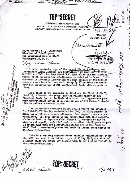 在场的所有人都记得石井的话:“731部队的秘密要带入坟墓!”研究731部队历史的日本作家青木富贵子从石井四郎的日记中考证,这句话实际上是出自陆军参谋总长之口,为的是避免细菌战秘密为美军所知,进而危及到日本天皇。 ![]() ![]() 美军德特里克生化武器基地的细菌专家,在全日本秘密追踪731部队核心战犯,私下达成交易,交出所有731部队细菌战数据,秘密大赦 其实,二战结束前,美军便已获悉日军在中国进行细菌战的事实,试图通过各种渠道去了解细菌战和有关实验的情况,并派遣了来自德特里克生化武器基地的细菌专家莫瑞·桑德斯中校于1945年9至10月,在驻日盟军最高统帅司令部支持下,对日本东京陆军军医学校、日本参谋本部、陆军省医务局以及731部队有关人员进行调查,审讯了731部队的主要成员内藤良一、金子顺一和增田知贞等人,于当年11月1日完成有关731部队的一份研究报告,即《桑德斯报告》。 那时,桑德斯便开始与占据日本的盟军司令麦克阿瑟讨论如何处理731部队所拥有的数据,并初步做出了对相关人员大赦的决定。 此时,石井逃回千叶县老家躲了起来,1945年11月10日还在千代田村举办过一场假的葬礼,并在村长掩护下潜伏起来。 与此同时,根据《日本产经新闻》披露,一份据分析于1945年10月前后在一张八开便签上手书并盖有陆军大印的文件显示,那时盟军司令部已经开始对石井四郎的助手增田知贞大校进行讯问,文件指示其余人员必须保密。 文件的开头写道:“‘O’及‘保作’绝对不能公开。”“O”是指“圆木”,即活体实验对象,“保作”系指细菌作战的暗语。文件中把收容丈夫房屋改称为“中央仓库”,把培养感染病毒的跳蚤的田中班简单地称为“P(病毒)研究”,把研究用于损伤谷物的细菌武器的八木泽班的实验场称为“自营农场”。 文件还指示北野政次要恪守下述口径,即研究细菌战“不是遵循上司的指示,而是根据防卫研究的需要,由一部分人进行的研究”。 但是,美军经由长时间的追踪与接触,很快还是掌握了石井的活动,并在审理日本战争犯罪的远东国际军事法庭召开前与其相约谈判。 ![]() 1946年1月17日,美军同来自德特里克生化基地的细菌战专家阿尔沃·汤普逊(Arvo Thompson)中校在石井住所对其展开第一次审讯,调查内容是731部队编制和训练作战生产能力,石井只承认展开普通预防医学和野外实验的研究,否认存在细菌战计划、实战、人体实验以及与海军等其部在相关方面的合作研究。 美国方面对石井的回答并不满意,持续深入审问诸如资金来源、陆军本部负责人等问题,最后以此为基础,于1946年5月撰写了一份名为《关于日本细菌武器的报告》,又称《汤普逊报告》,这篇报告中,石井详述了731部队的规模、研究细菌武器、如何防御细菌战等内容。 事后,美军又多次审讯石井,后者提出,以免除自己和部下的战犯追诉为条件,愿意提供更详尽的细菌战资料,而这正是美国调查人员的目的。 事实上,那个时候,石井应该已经清楚: 一是交代731部队的详情,并不会危及天皇地位,因为美国已经确立了要保留天皇这一基本原则 二是731部队的数据对美国而言具有特殊价值,美方也表达了愿意为此达成交易的想法。 日本非政府研究小组“731部队·细菌战资料中心”共同代表近藤昭二接受采访时说,在远东国际军事法庭的美国检察官抵达东京前,他们就已经得到上级指示,不要去追究天皇的责任。 美国这么做是为了顺利实现对日本的战后统治,同时,出于对抗苏联的需要,美国不希望看到731部队的研究资料落入苏联手中。 ![]() ![]() 731生化部队为何会在西方视野中从未出现? 美军花费700美元得到731部队细菌战的核心机密,并将这支部队从历史中掩盖起来 1980年发表文章《日本细菌战:美国对战争罪的掩盖》的美国历史学者约翰·鲍威尔(John Powell),大概是现在可见最早撰写“日本对中国和苏联使用生物战的报道”的作者。他在1981年时写道:“据透露,美国政府参与掩盖行动的原因是,日本拥有使用细菌作为致命武器的专门知识,华盛顿非常渴望独自拥有它们。” 1947年5月6日,美军远东司令部向美国国防部发了一封军事密电,编号为52423,电文中就包括一段信息:“3-B。 其他包括从石井四郎那里获得的报告书等资料,建议可以通过以下方式来获取,即告知相关日本人,相关资料将通过情报渠道留存,不会作为战争罪行证据来使用。” 对此,当年6月26日,德特里克基地医学专家在美国政府的备忘录中说:“应与石井及其同事达成的一项协议,确保他们在日本细菌战计划中提供的信息将保留在情报渠道中,这等同于美国政府提供协议,不会以战争罪起诉他们中任何人。” ![]() 1947年7月1日,德特里克基地两名医学专家在备忘录中说,日本研究人员从活体实验中提取了成千上万张人体组织玻片,如果美国能够保证将日本医生和科学家从战争罪起诉中解救出来,那么就可以得到731部队研究人员的幻灯片和报告。 这两位医生,爱德华·维特(Edward Wetter)和H·I·斯图布尔菲德(H。 I。 Stubblefield)辩称,由于“任何战争罪审判都将向所有国家完全披露此类数据,因此,为了美国的国防和国家安全,应该避免将此事公开”。 这两人进一步指出:“日本人从他们的实验中获得的知识将对美国细菌战研究计划具有重大价值,而日本细菌战的数据对美国的价值,在国家安全领域的重要性,要远远