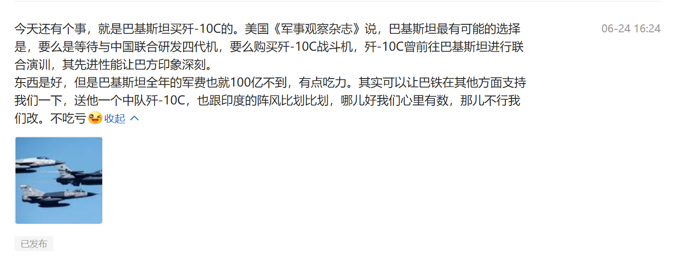 半个月前,我说中国可以送巴铁一个歼-10C中队,不会亏。这才半个月,应验了。[呲牙][呲牙]7月5日,巴基斯坦战略与国际事务研究所(HSIA)在推特上发布消息称,“巴基斯坦将在2021年底前从中国获得36架歼-10C战斗机。”关键词:歼-10C、36架、获得(用词巧妙)。 |