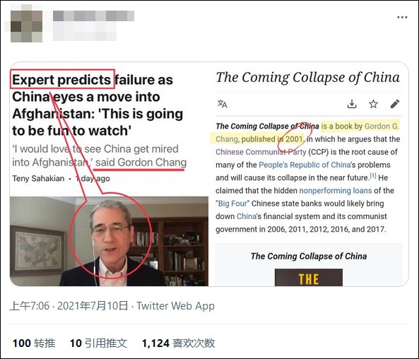 “中国崩溃论”学者又来“预测中国” 遭网友群嘲原标题:“中国崩溃论”学者章家敦又来“预测中国”,遭网友群嘲 [文/观察者网 熊超然]正当美国“悄悄”从阿富汗撤军,塔利班又向中国发出了一番友好表态之际,常年散播“中国崩溃论”的美籍华人章家敦(Gordon G。 Chang)又活跃了起来,发表的观点还是“熟悉的味道”。 当地时间7月8日,章家敦在美媒《国会山报》上发表了一篇署名文章,题目为“中国将成为下一个进入阿富汗‘坟墓’的帝国”,通篇“预测感”拉满。写完文章还不够,表达欲爆棚的他同日又接受了另一家美媒福克斯新闻网的视频连线采访,再度重复他的这些观点。 章家敦宣称,中国用“一带一路”和其他投资帮助阿富汗,是想达成扩大影响力、获取自然资源、夺取战略通道和掩盖所谓“种族灭绝”等目的。然而,一旦中国介入阿富汗,想要退出非常困难,即便成功也将付出巨大代价,只要时间一长,中国就会失败。 只不过,“坚持不懈”地散播“中国即将崩溃”等言论,热衷于各种“预测”,却又每次被“狠狠打脸”的他,如今早已沦为一个笑柄。许多推特网民又开始对他无情嘲讽和吐槽,有人甚至求他,别再糟蹋“预测”(predict)这个词了…… 《国会山报》文章截图 福克斯新闻网报道截图在福克斯新闻网文字报道的开头,该媒体首先声称,对于中国而言,阿富汗是“战略拼图”中的关键部分,这个国家被看作是一个“门户”,中国军事力量可从此通过伊朗或巴基斯坦,随之进入阿拉伯海。 “阿富汗还可提供通往伊朗和中东的通道,以及通往印度洋和非洲的通道。”福克斯新闻网介绍完“背景信息”后,随即引出了被其冠以“作家兼中国问题专家”头衔的章家敦,声称当中国准备用大力投资的方式确保自身在阿富汗的影响力时,他对中国成功的能力表示怀疑。 “是的,我认为他们(中国)比我们(美国)更有机会实现在阿富汗的目标,因为中国人更邪恶。但是有更好的机会不意味着就能成功,我认为只要时间一长,他们就会失败。”采访伊始,章家敦就先对中国进行这般攻击。 “我们已经看到,中国在一些难以控制的地区建立了关系,但这(阿富汗)对他们而言将是一个更大的承诺。”章家敦表示,阿富汗是与中国大陆接壤的14个国家之一,一旦中国介入其中,想要退出就极其困难。“这并非是什么‘距离遥远的担保’,只需撤资就能了结的。” 章家敦受访视频截图福克斯新闻网也在后续的文字报道中,配合章家敦的论调,介绍了它们所了解到的中国在阿富汗的投资情况。 报道称,中国已经在与阿富汗政府谈判,通过“一带一路”倡议投资该国基础设施建设。报道同时宣称,开发阿富汗丰富的自然资源也是中国的长期目标,通过向较贫穷国家提供基建贷款,中国想要换取对当地资源的控制权,利用阿富汗扩大自身影响力。 章家敦声称,中国欲利用在阿富汗的布局来延伸“一带一路”,特别是该倡议在巴基斯坦的首要项目——“中巴经济走廊”。他作出预测,认为此举可能最终惠及阿富汗人,而非中国人。 “就阿富汗人的思维方式而言,我不认为‘一带一路’真的重要,这只会让他们对于中国更有分量,因为一旦你开始建设基础设施,你就必须保护它。” 章家敦还声称,中国想要获取阿富汗的自然资源可能要付出比预期更昂贵的代价,“阿富汗是一个不守规矩的国家,即使(中国)有30年的铜矿租约,也无法从中获益。” 当地时间2020年10月25日,作为“一带一路”倡议下中巴经济走廊首个签约实施的大型轨道交通项目,巴基斯坦拉合尔轨道交通橙线地铁正式开通投入运营。图自澎湃影像一番“分析预测”过后,章家敦又扯上了“新疆问题”,宣称中国在阿富汗获得“立足点”后,试图凭借“买来的影响力”让塔利班在所谓“新疆维吾尔人种族灭绝”的议题上禁声。 “虽然(中国人)是邪恶的,但我不认为他们与其面对的势力一样邪恶。”章家敦扬言道:“他们与塔利班关系良好,但塔利班并非阿富汗社会的唯一组成部分,许多激进分子有着不同的利益。印度可以让这些组织在阿富汗对抗中国,折磨中国人,让他们陷入困境。” 对于美国从阿富汗撤军一事,章家敦认为这是一个正确的决定。他说:“我们在阿富汗陷入泥潭。目前,美国最大的威胁不是阿富汗的武装分子,而是中国。” “中国有很多钱,他们可以做很多事,但他们无法做所有的事,现在已经超负荷了。”章家敦渲染道:“看起来他们要为某事增加更多承诺,是的,也许他们会成功,但将付出巨大代价。我希望看到中国深陷阿富汗泥潭,这将会很有趣。” 可能是对于自己接受采访时的言论沾沾自喜,章家敦之后还在个人推特上贴出了福克斯新闻网的文字报道链接,而他所写的推文则比其受访时所说的“泥潭”更为耸动,呼应了此前在《国会山报》上发表的文章——“是时候把中国送到‘帝国的坟墓’(graveyard of empires)了”。 图自推特 下同现年70岁的章家敦,自2001年出版《中国即将崩溃》一书后,20年来“孜孜不倦”地渲染散播所谓的“中国崩溃论”,博出位的同时备受争议。 近些年以来,章家敦每年都要唱衰一次中国,预测“中国必将崩溃”。然而,其言论不仅荒谬绝伦,中国近年来愈发强劲的发展势头更是屡屡对其“狠狠打脸”。他甚至已经被中国网友戏称为“战忽局人士”。 有推特网民就将福克斯新闻网的这篇采访