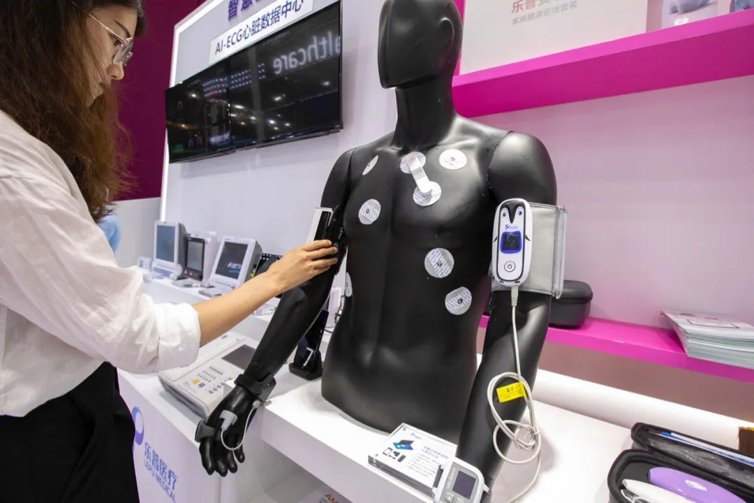2021年7月10日,上海,世界人工智能大会,乐普医疗,穿戴式智能遥测预警系统,集心电血压计一体设计,人工智能心电分析报告,无线传输,APP数据管理。