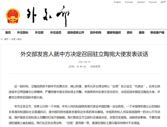 中国召回驻立陶宛大使 台媒担心“圭亚那事件”重演来源:来源:环球时报 ![]() 图源:外交部网站 [环球时报综合报道]中国外交部10日下午宣布一项重磅决定:召回中国驻立陶宛大使,并要求立政府召回驻中国大使。中国作出这一决定的原因是“立陶宛政府不顾中方反复交涉、晓以利害,宣布允许台湾当局以‘台湾’名义设立‘代表处’”。在观察人士看来,中国此举既让人感到意外,也在情理之中。意外是因为,在中国的对外交往史上,“召回大使”的做法极为罕见,上一次中国这么做还是26年前。但由于立陶宛过去一段时间的作为已触犯到中国的核心利益,中国出手惩罚也被认为是势所必然。作为一个人口仅约280万的波罗的海小国,立陶宛出于各种动机冲到反华一线,接二连三与台湾勾连,突破不进行“官方往来”的底线。有评论称,中国这次用具体行动表达了自己的愤怒,并展现出维护国家利益的坚定决心。多名国际问题专家告诉《环球时报》记者,若未来立陶宛仍继续“挑战”中国,不排除出现两国断交的局面,接下来就看立陶宛能否及时“纠错”了。专家认为,中国借此对其他一些国家也发出“不要错判形势”的警告,对台当局也是一个震慑,正如国台办发言人10日所说:勾连外部势力进行谋“独”挑衅,只能自食恶果! “我们敦促立方立即纠正错误决定” 中国外交部官网10日刊登“外交部发言人就中方决定召回驻立陶宛大使发表谈话”新闻稿称,近一段时间,立陶宛政府不顾中方反复交涉、晓以利害,宣布允许台湾当局以“台湾”名义设立“代表处”。中国政府对此表示坚决反对,决定召回中国驻立陶宛大使,并要求立政府召回驻中国大使。 “我们敦促立方立即纠正错误决定,采取切实措施,消除恶劣影响,不要在错误的道路上越走越远。”发言人称,“我们也正告台湾当局,‘台独’是死路一条,图谋在国际上搞分裂活动绝对不会得逞。” “在围绕台湾的争执中,中国要求立陶宛召回大使。”路透社10日称,上个月,台“外交部”宣称将在立陶宛设立“驻立陶宛台湾代表处”,这是其在欧洲国家设立的第一个以“台湾”为名的代表处,通常使用的是“台北”。报道称,此前北京已经谴责了台当局的决定,现在更进一步用具体行动来表达愤怒。 据台媒报道,当时立陶宛外交部发布新闻稿,也以“国家”称呼台湾,表示将在今秋在台设“办事处”。中国方面则敦促立陶宛恪守一个中国原则。 10日,立陶宛外交部迅速回应,一方面“表示遗憾”,一方面“重申”决心遵照一个中国原则,同欧盟及世界其他地区国家一样与台湾建立互利关系。“我们正在思考下一步。”立外长表示。 值得一提的是,在宣布召回大使前,中国驻立陶宛大使申知非于8月7日在立陶宛《共和国报》上发表署名文章,指出立陶宛政府屡次在台湾问题上公然违反一个中国原则和国际关系准则,严重侵犯了中国主权,干扰了中国统一进程。 中国社会科学院欧洲研究所副所长刘作奎10日接受《环球时报》记者采访时表示,从外交上来讲,召回大使是严重程度很高的一种行动。很显然,中国对立陶宛近期的行为予以了力度极大的反击。他表示,立陶宛允许民进党当局以“台湾”名义设立“代表处”,比此前捷克议员访问台湾还要更严重,因为议员不能代表政府行为,而立陶宛这次则是毫无疑问的政府行为,因此,中方的反击力度在意料之中。 中国国际问题研究院欧洲研究所所长崔洪建对《环球时报》记者说,立陶宛在台湾问题上触犯到的是中国的核心利益,已直接影响到两国关系的政治基础,中方召回大使的举动意在向立方传递“绝不接受”的明确态度。这一举动在中国外交的历史上非常少见,也说明两国关系已遇到严重挫折。 中国“前所未有的举动” 在中国的对外关系史上,因与某国关系紧张而召回大使的情况极少。1966年,由于印度尼西亚国内出现反华潮,中国召回大使。次年,两国进一步走向断交。上世纪80年代,荷兰政府批准售台潜艇,中国召回大使。1981年5月,中荷外交关系降为代办级。 最近一次是1995年,克林顿政府允许李登辉以访问母校名义至美国逗留并发表政治演说,致使中美关系遭受重大挫折。中国作出强烈反应,主动停止原定的高层官员访问和接触,并以述职名义召回时任驻美大使李道豫。 “立陶宛激怒中国,”德国新闻电视台10日评论道,尽管中方多次表态并概述可能出现的后果,立政府仍决定允许台当局设立一个以“台湾”命名的代表处。不过,中国最新的决定并不意味着两国外交关系的终结。 “这是中国前所未有的举动。”俄罗斯《观点报》10日援引俄汉学家瓦维洛夫的话说,此前中国几乎没怎么将召回大使用作外交工具,这进一步证明,中国外交变得更加果断,更加坚定地捍卫自己的立场。美国彭博社称,中国“划出红线”,向其他寻求与台湾发展更“正式”关系的国家发出“罕见”警告。 有分析称,过去几年,立陶宛一直在向台湾靠拢,特别是去年10月大选后,立新政府承诺推动“以价值观为基础的外交政策”,积极发展对台关系。除了计划与台湾互设新机构,立陶宛还是欧盟国家中第一个宣布捐赠疫苗给台湾的国家。 崔洪建表示,中立关系的变化和当前中欧关系遇到的困难与挑战有一定联系,但也有诸多不同之处。他解释说,立陶宛近期对华态度改变,最主要原因是其国内政治变化与国际地