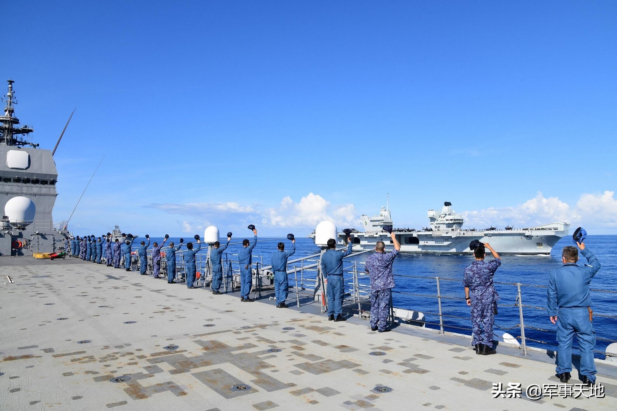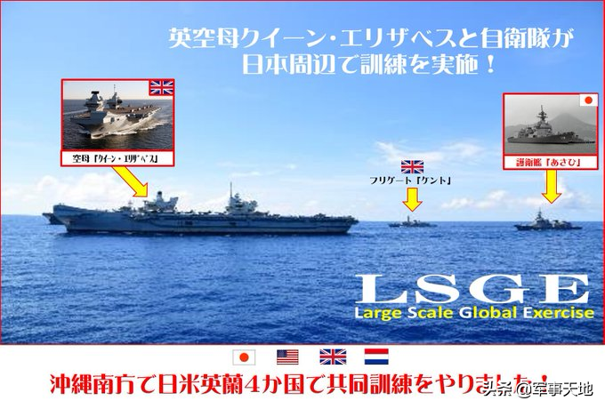 8月25日,英国皇家海军通报,“来自英国、荷兰、美国和日本海上力量,由航母、战舰、飞机和海军陆战队组成的强大海军力量,在东海齐聚一堂,举行了一次具有里程碑意义的联合演习。”“由英国皇家海军伊丽莎白女王号航空母舰领衔的英国航母打击群,与美国海军第七远征打击群以及日本海上自卫队的军舰合作,以证明三国海军有效合作的能力。”(英国人把护航的荷兰海军护卫舰给忘了)。英国皇家海军表示,“为期12天的联合演习结束时,参演舰艇以编队形式航行,展示了英国、荷兰、美国和日本海上力量。”