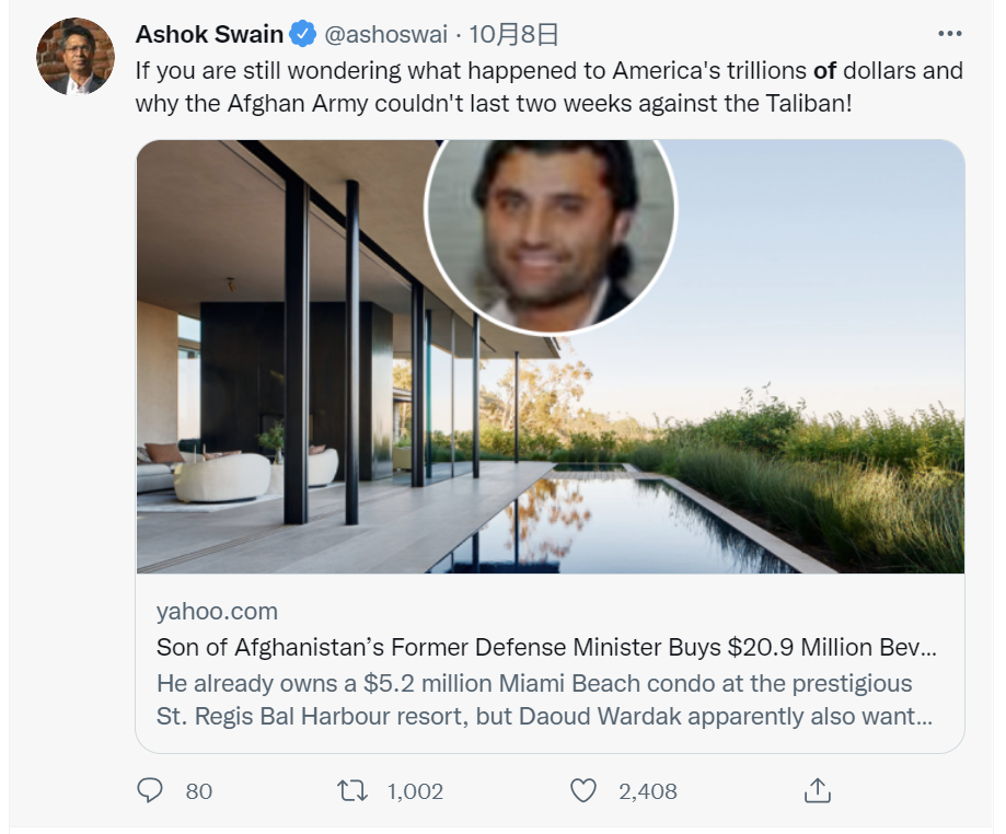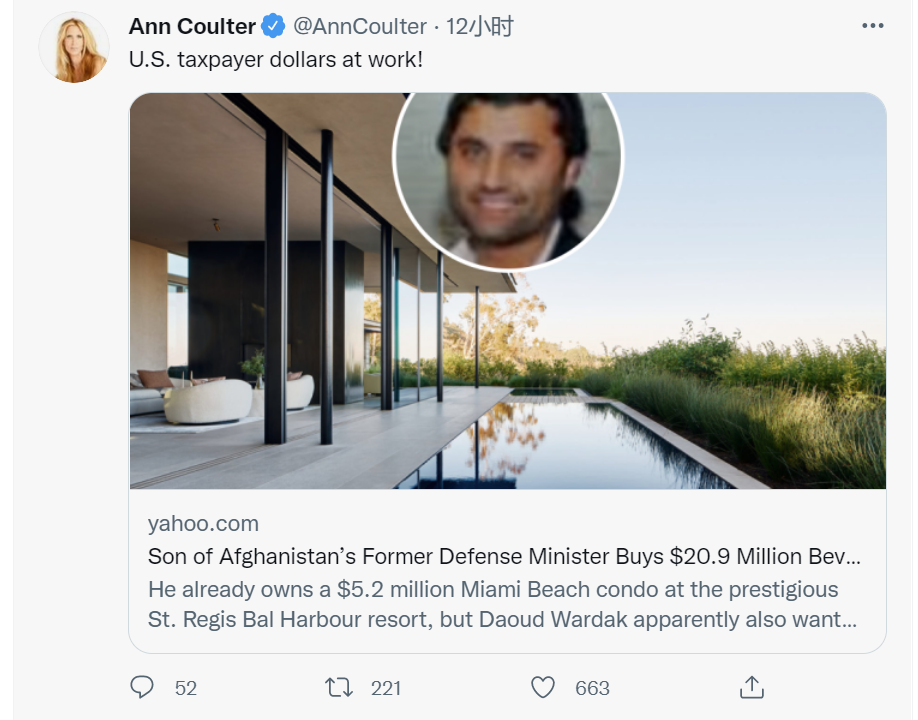 在这一消息曝光后,有外国网友在社交媒体上怒斥“瓦尔达克花的是美国纳税人的钱”,还有人在转帖时称“如果你想知道为什么美国花了几万亿美元,而阿富汗政府军却无法抵挡阿富汗塔利班两个星期?”,暗示阿富汗前政府的腐败问题导致军队缺乏战斗力。