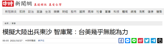 [环球网报道 记者赵友平]“模拟大陆出兵东沙,智库惊:台美几乎无能为力”,今天的台湾“中时新闻网”以此为题,披露了美国智库“新美国安全中心”26日发布的一份报告内容。根据该报告,“新美国安全中心”针对中国大陆攻入东沙岛的设想进行兵推,却发现台、美“几乎找不到可靠的手段”,能在不让冲突进一步升级下迫使中国大陆撤出该岛。