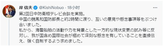 通话结束后,日本防卫省官方推特还专门发了两条中文帖子,介绍通话内容。双方就明年开通防务部门直通电话达成一致,更是被单独列了出来。